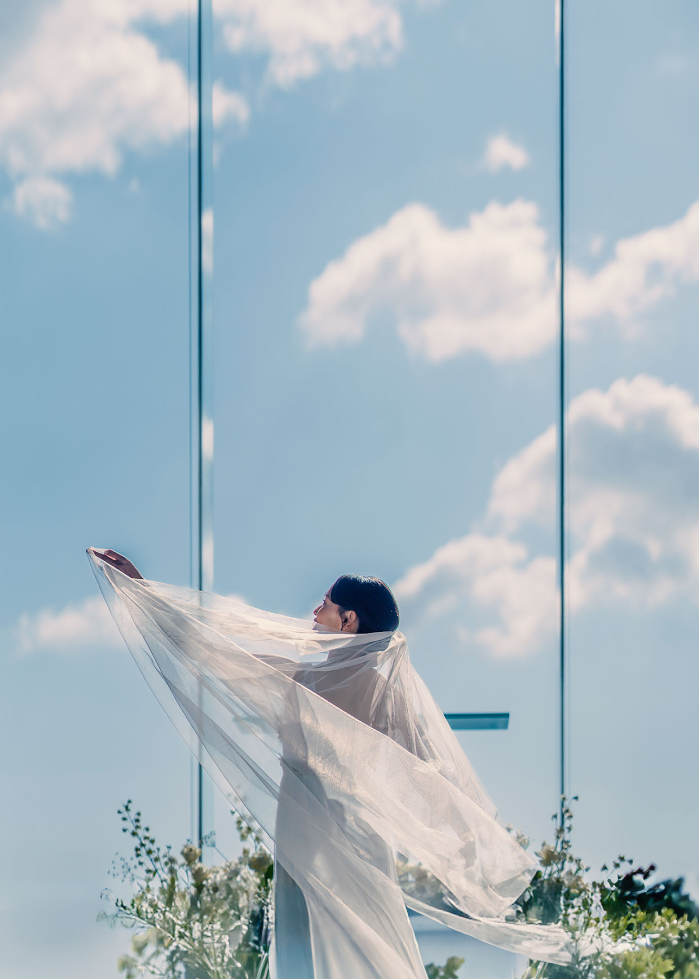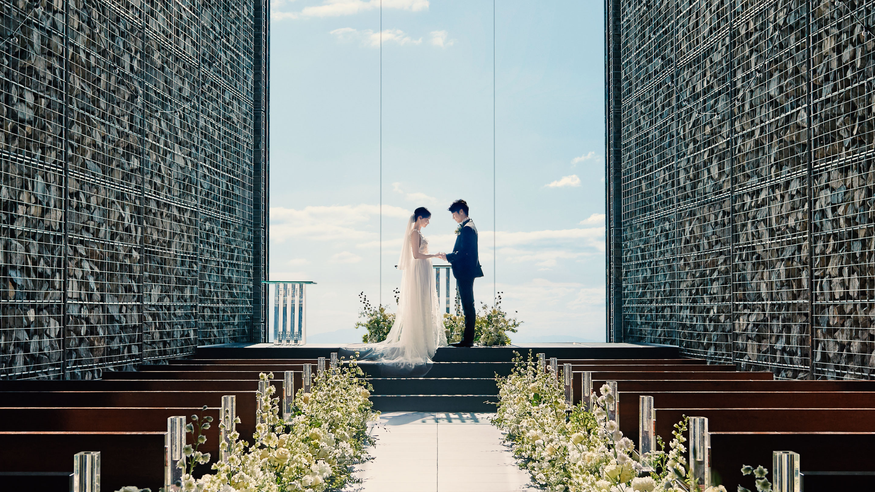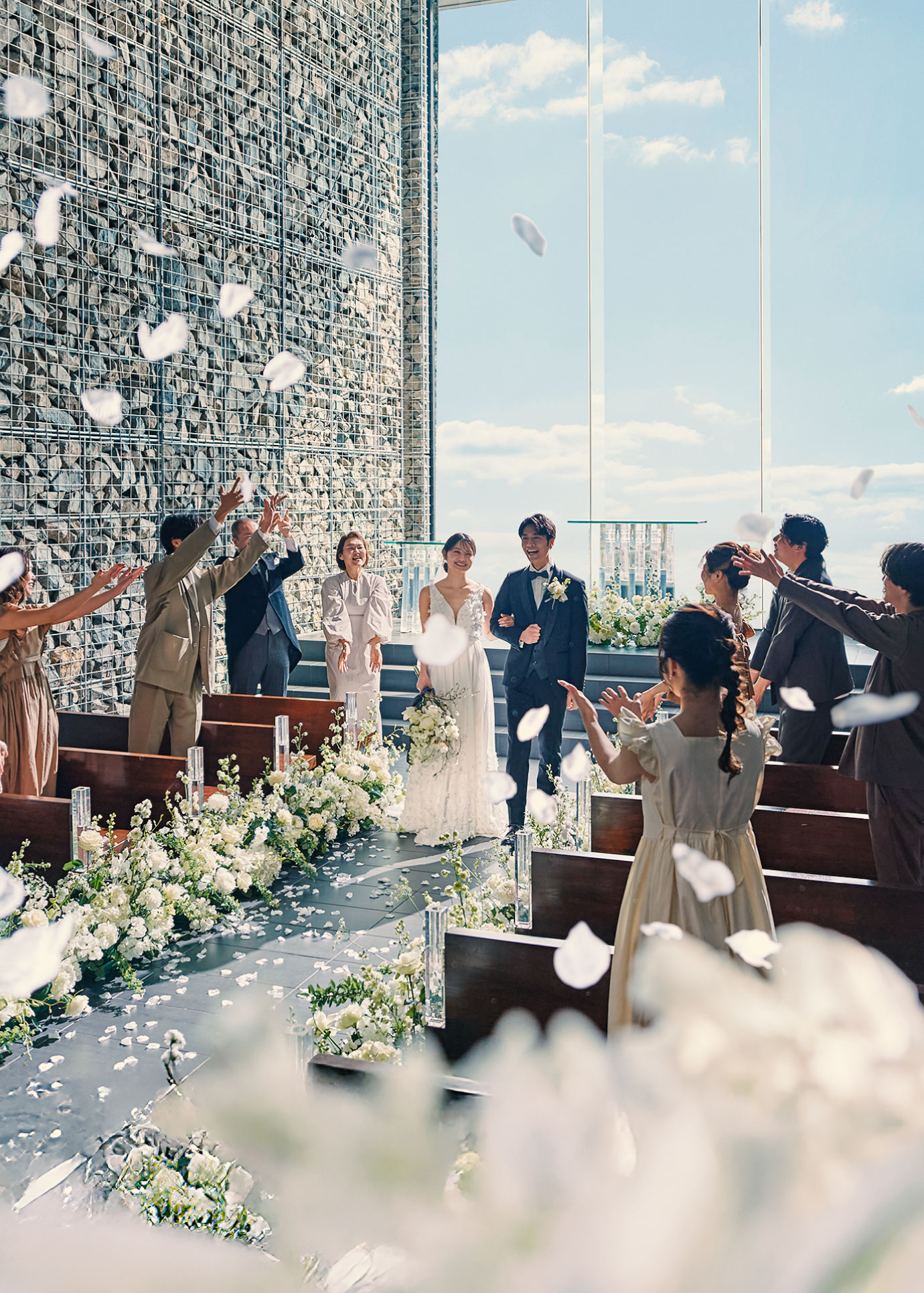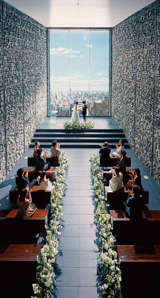 バージンロードを進んだ先には、一面のガラス窓越しに大空をのぞむ祭壇が。おふたりが立つと、その姿はまるで空に浮かんでいるかのよう。降り注ぐ光も相まって、誓いのシーンがドラマティックな感動に包まれます。
