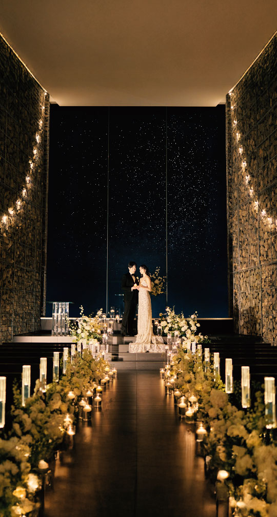 チャペル内に入った瞬間に目を奪われるのは、高天井のスケール感と御影石を積み上げた壁面、そして天空へ向かってのびるバージンロード。非日常のドラマティックなしつらえが、おふたりの旅立ちを祝福します。