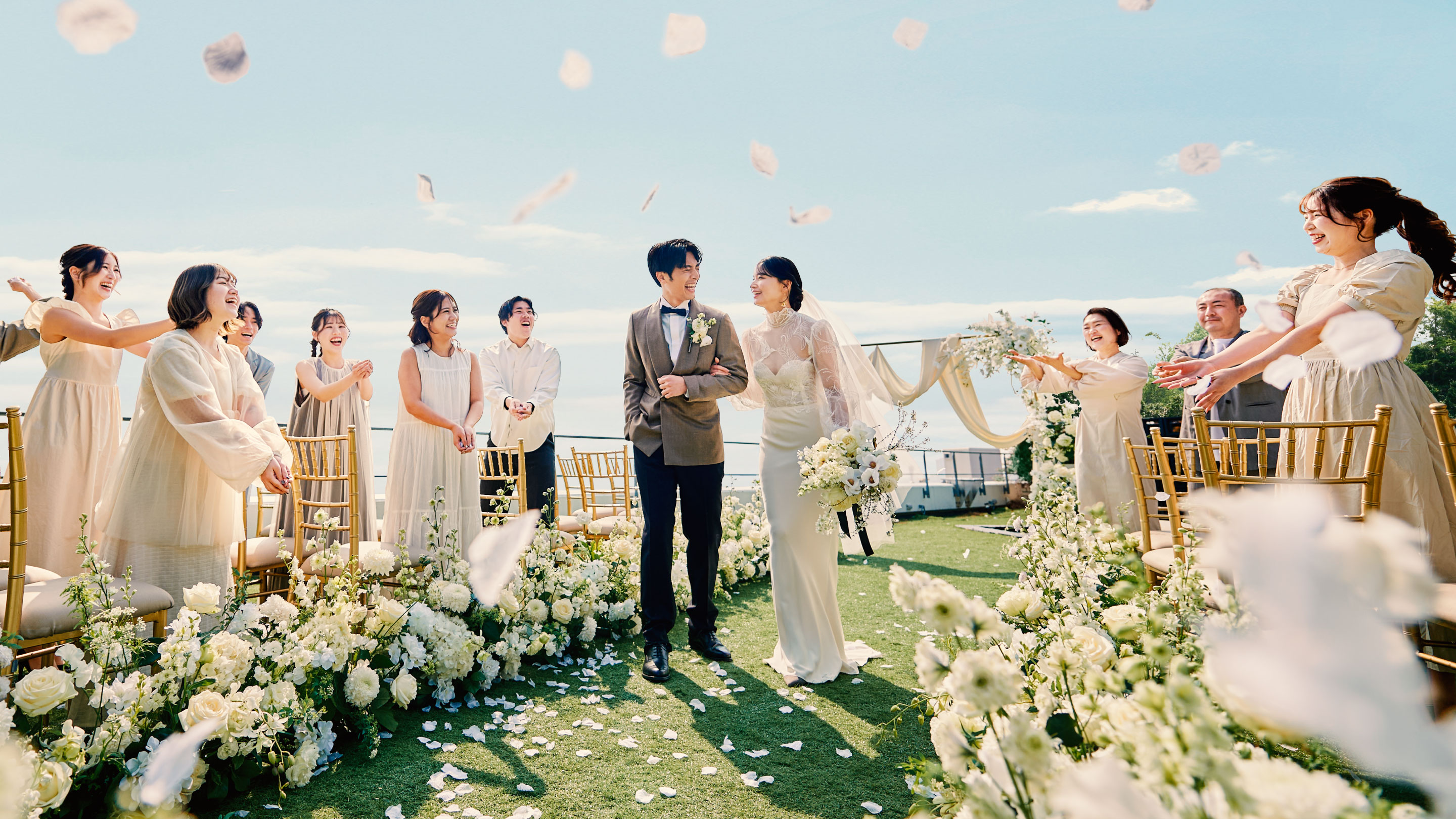 お母様から新婦様への最後の身支度となるベールダウン、ゲストからの温かな祝福に包まれるフラワーシャワーなど、セレモニー前後の演出も天空からの贈り物。神戸の夜景と星空に包まれるナイト挙式にもぜひご注目ください。