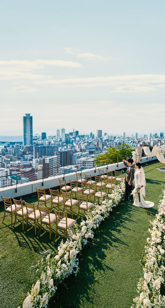 青空の下、神戸らしい圧巻の眺望が広がる屋上庭園「レトワール」。その時々に出会える緑、自然光、風が幸せの門出に立つおふたりを祝福します。プライベート感たっぷりのこの場所で、家族やゲストに囲まれながら執り行う挙式は一生忘れられないものに。