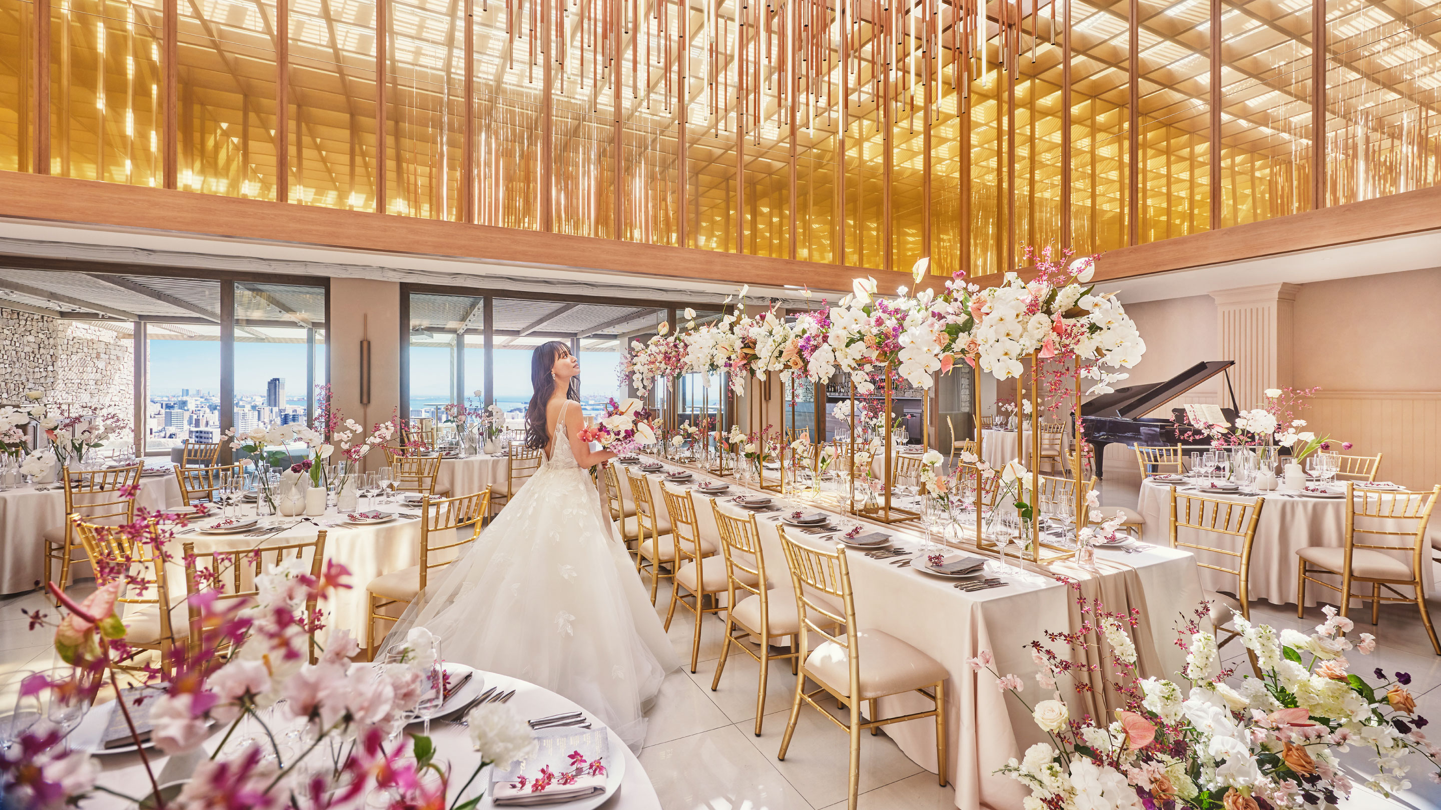 吹き抜けの天井からあふれんばかりに降り注ぐ自然光とシャンデリアの光に包まれる開放感はここならでは。神戸の絶景を望む全天候型ガーデンも相まって、記憶に残るひと時になるはずです。