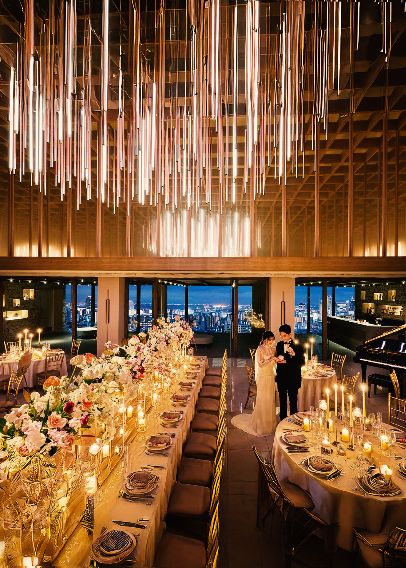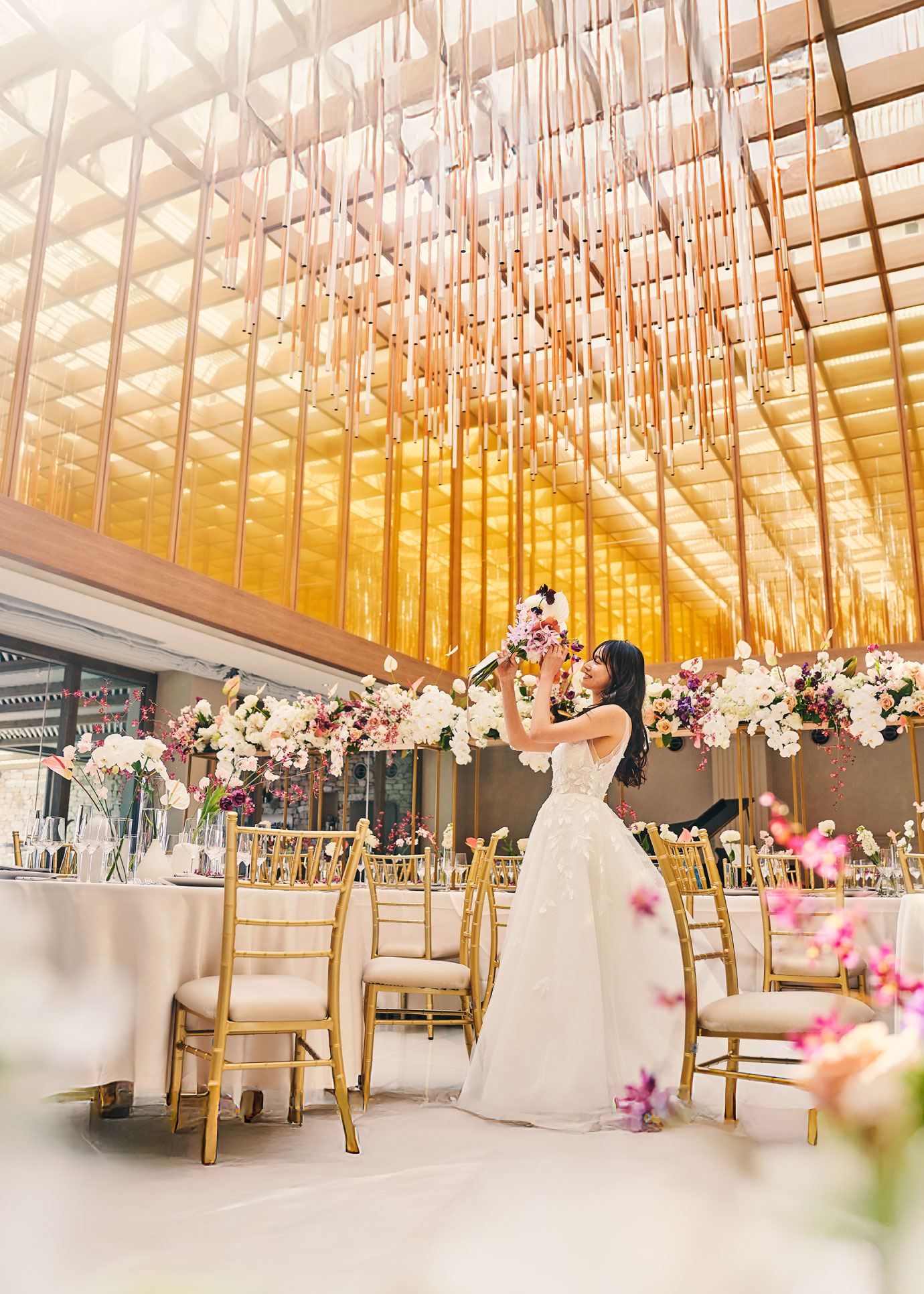 シャンパンゴールドを基調にしたノーブルな空間がゲストをお出迎え。吹き抜けのガラス天井にきらめくシャンデリアと自然光のコントラストがパーティをより印象的なひと時に演出します。