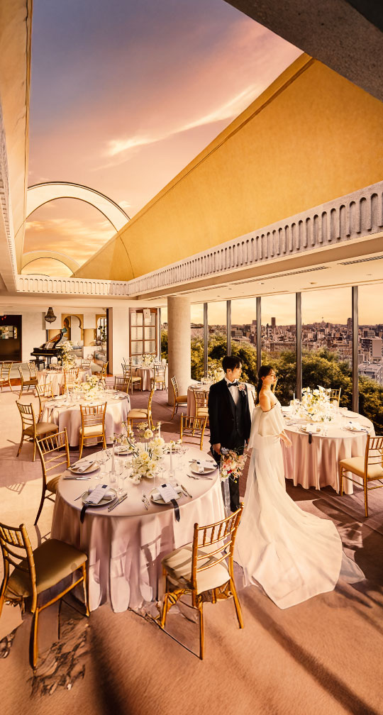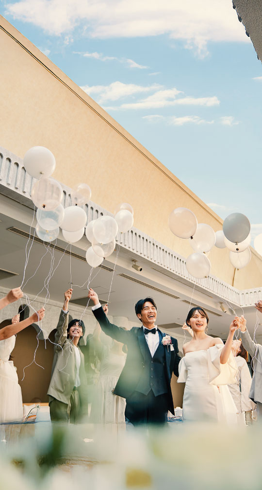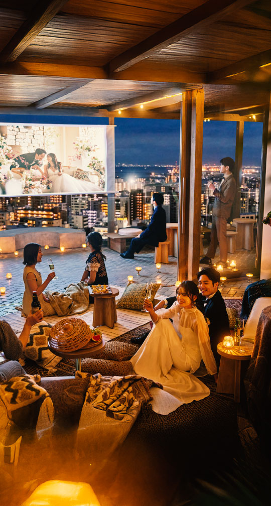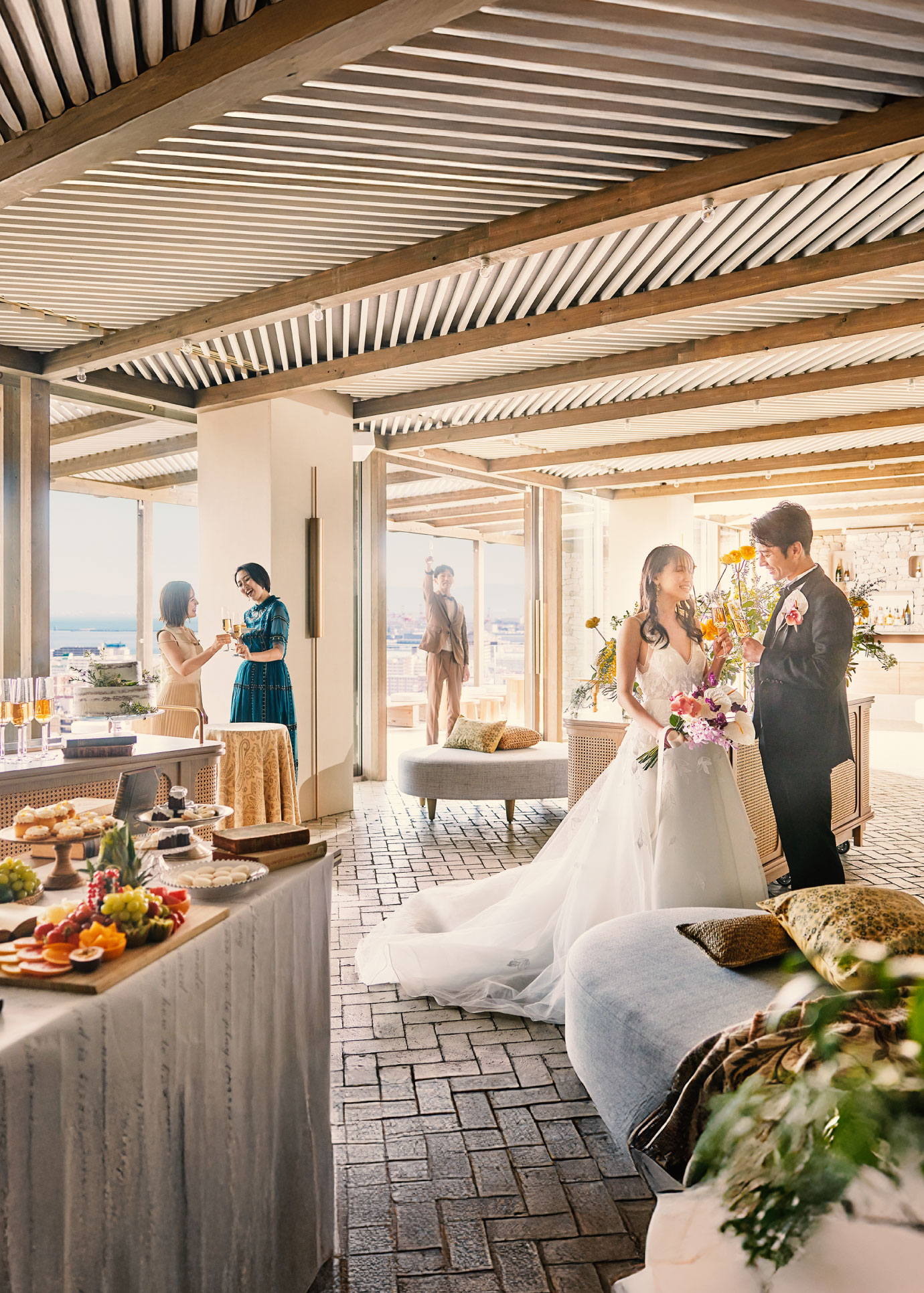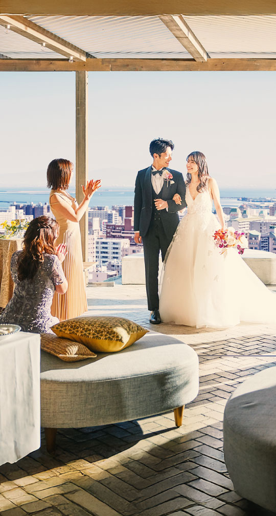 そして、披露宴の演出の幅を広げるのが、秘密の通路を通って向かう屋上庭園のレトワール。目の前に広がる神戸の山と海のパノラマビューが、ゲストを驚きと高揚で包みます。ここで叶えるバルーンリリースやデザートタイムはきっと忘れられないシーンに。