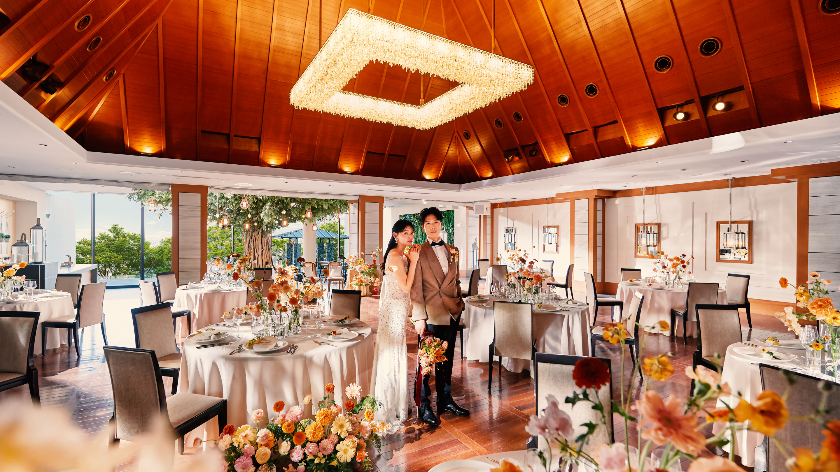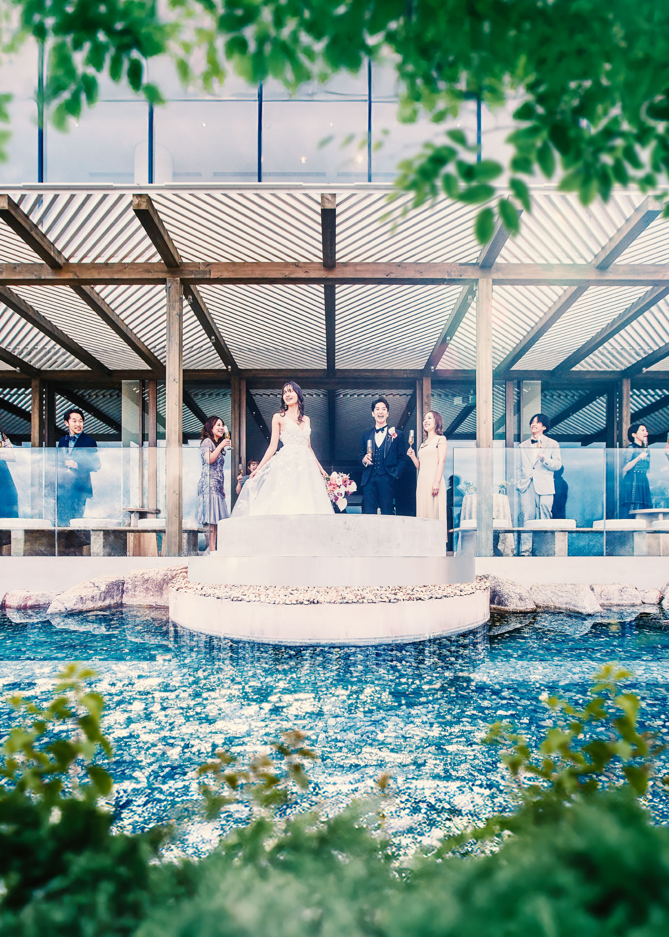 隣接のテラスに出ると、心地よい水音が響くウォーターコテージが。このスペースももちろん、当日おふたりだけの貸切となります。お好みのアイテムを飾り、異国のリゾートで過ごす感覚のゆったりで温かなパーティをお楽しみください。