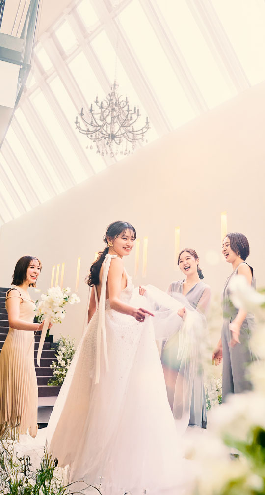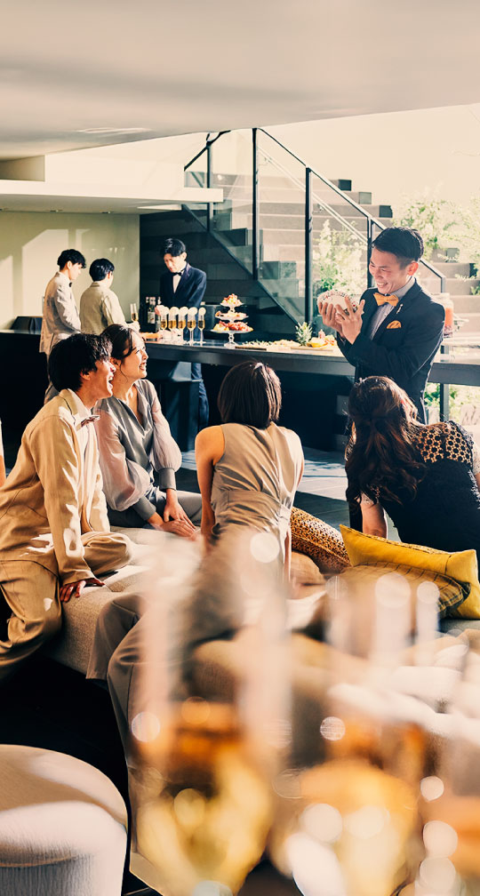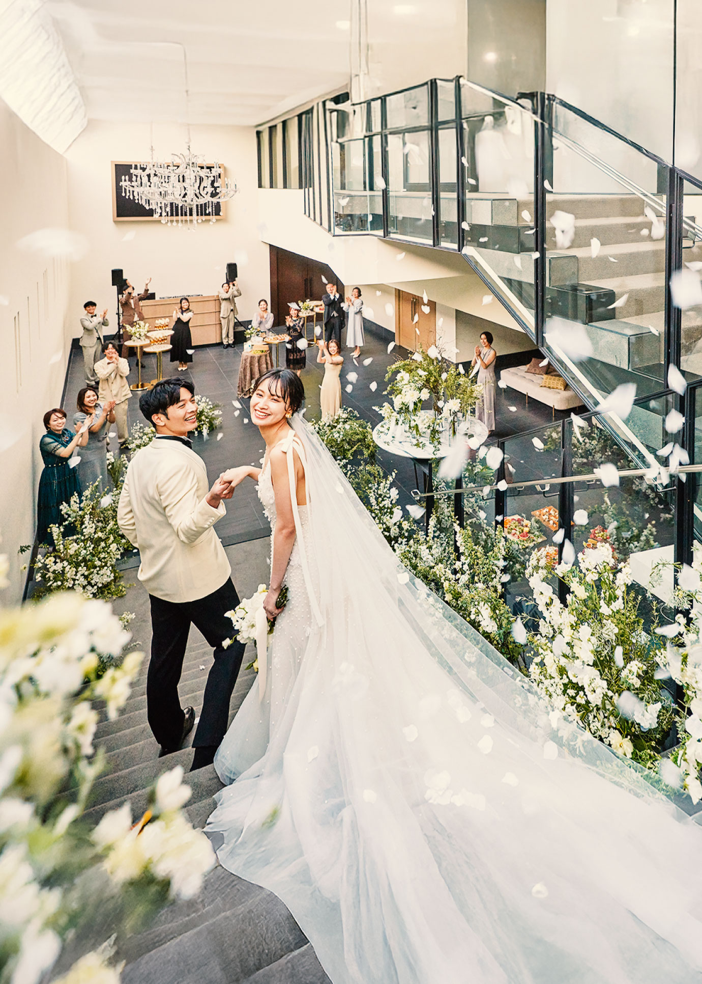 階段から登場するおふたりをゲストの温かな拍手と歓声が迎えます。その後は、やわらかな自然光に包まれながら、お一人おひとりとおしゃべりを楽しんで。誰もがいつもの笑顔になり、これから始まるパーティへの期待感もぐっと高まるはず。