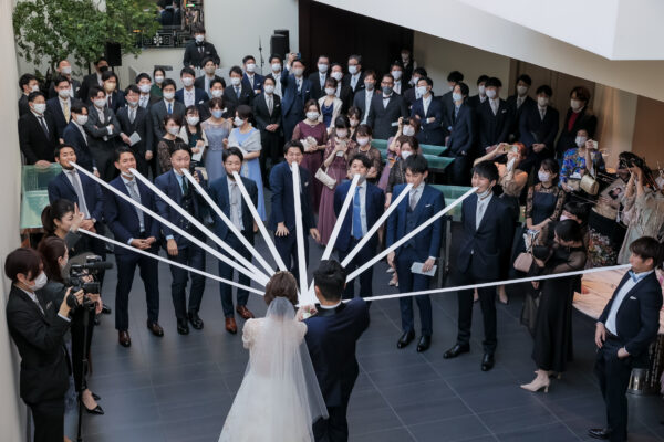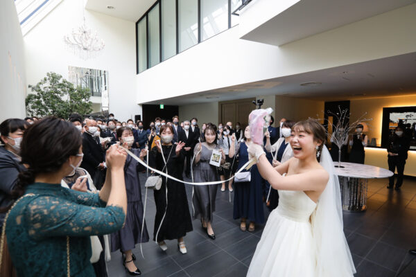 皆さん一斉に引っ張って頂き、見事花嫁さんのブーケと繋がっていた方にブーケプレゼントという演出になります。