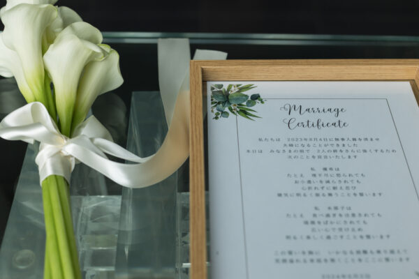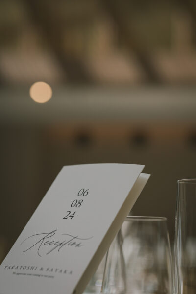 会場の入り口付近に一つだけご用意するシーティングチャートというアイテムをご用意されるかどちらかでゲストの皆様のお席を知らせるアイテムが必要となります。
