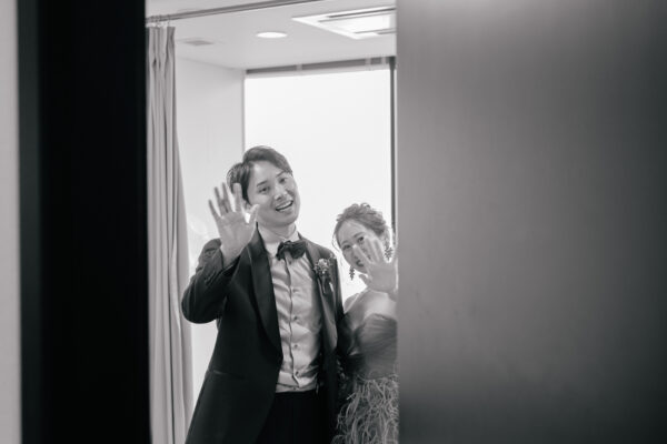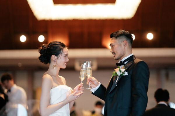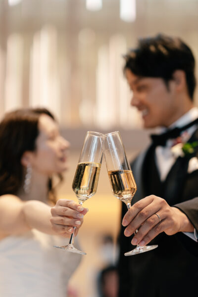 ご新婦様ととご新郎様がグラスを持って