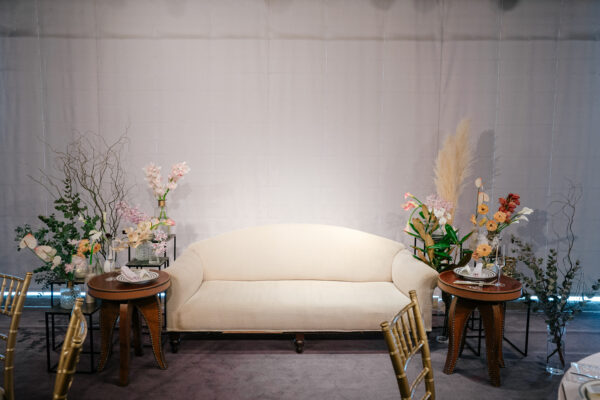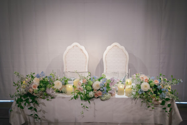 おふたりの前にボリューム感ある装花がくるので上品さ・華やかさも出る