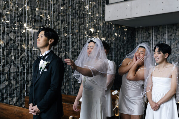 それぞれがベールを付けたり、白いワンピースをまとい、なりきり”新婦スタイル”でワクワクしながらゆっくり新郎のもとへ向かいます!