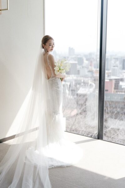 ロングベールの透け感とグレーのコントラストが
