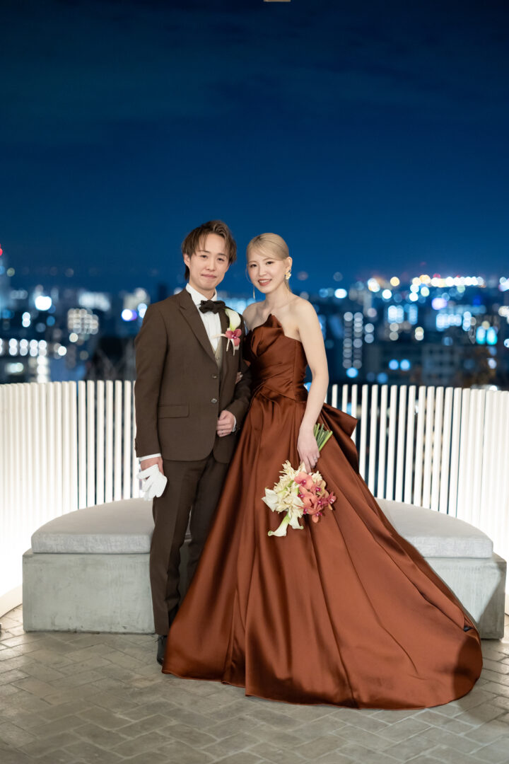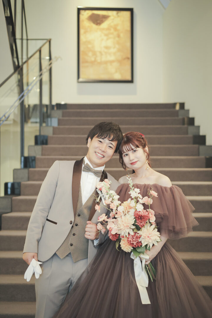 ブラウンタキシードには、同じくあたたかみのあるカラーがぴったり♡