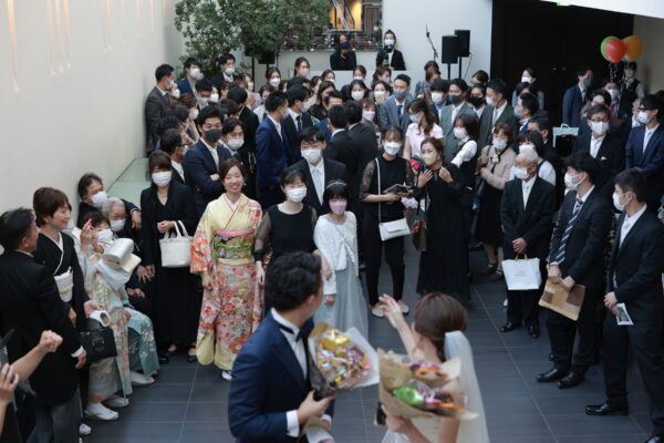 「ブーケトス」とは女性ゲストに向けて花嫁が後ろを向いてブーケを投げる演出です