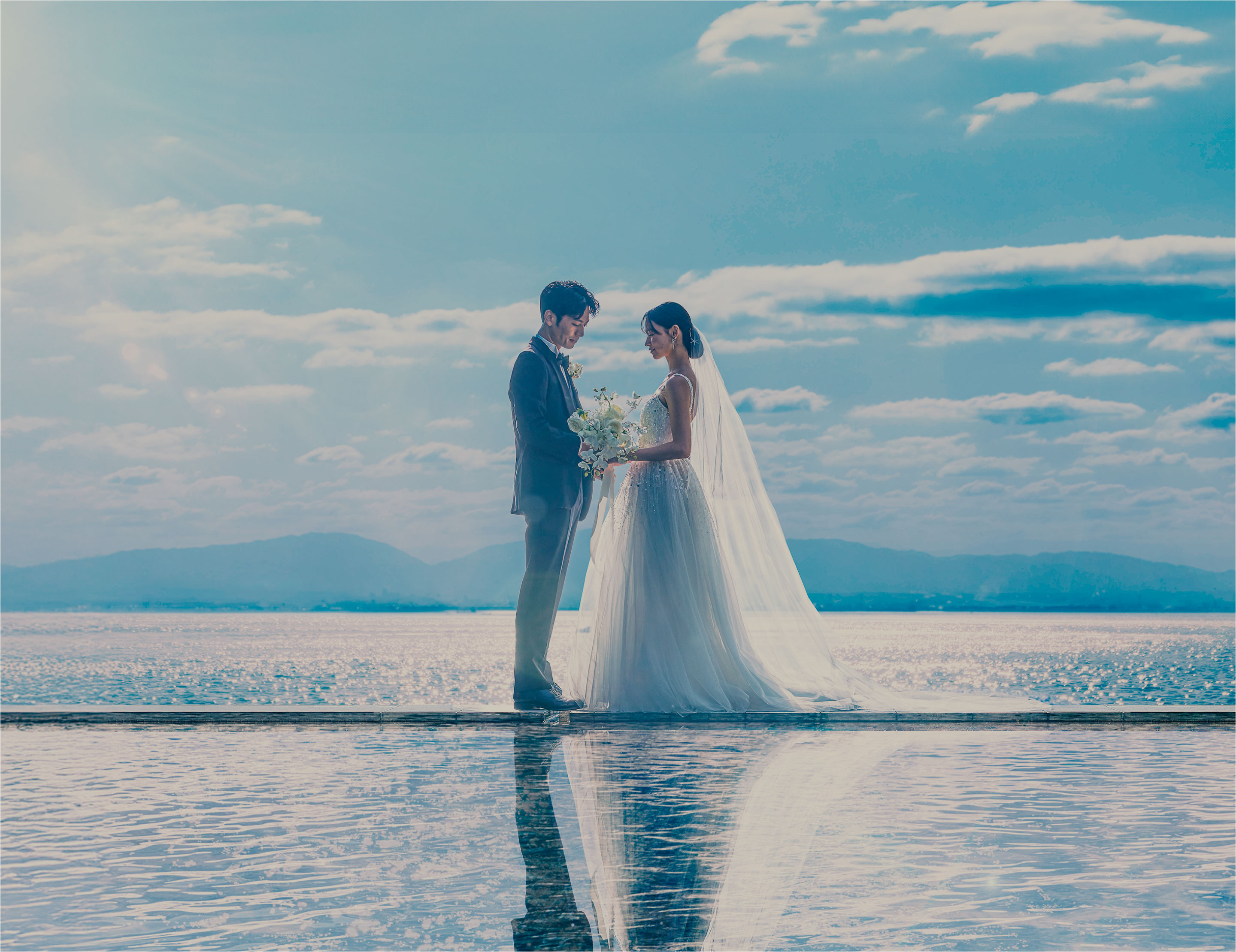 「天空(ソラ)の教会」と名付けられたこの場所は、どこまでも広がる空と、かつて祈りの対象だった石、生命の源である水をモチーフに建てられました。正面に大きくとられたガラス窓越しに望む空の景色と、やわらかな自然光がおふたりを包み込み、感動の式は厳かに、和やかに進められます。
