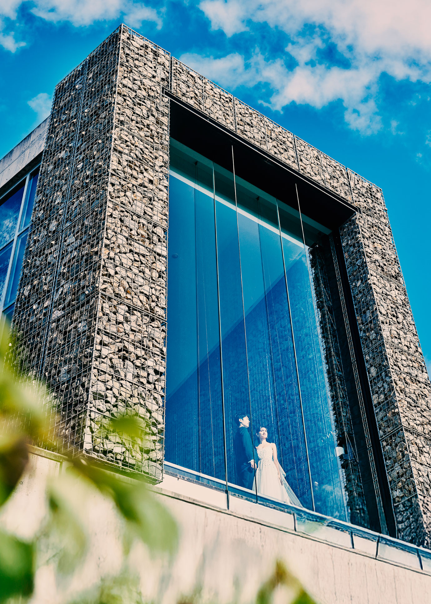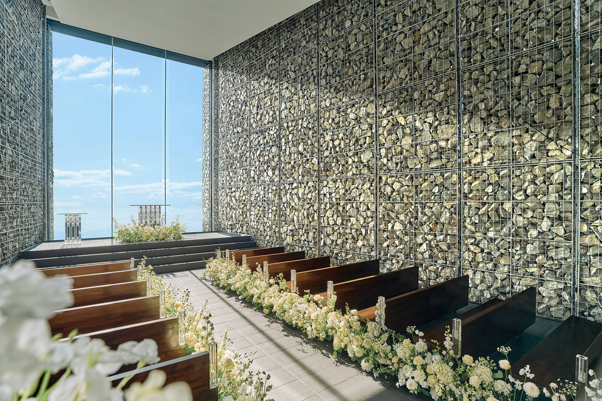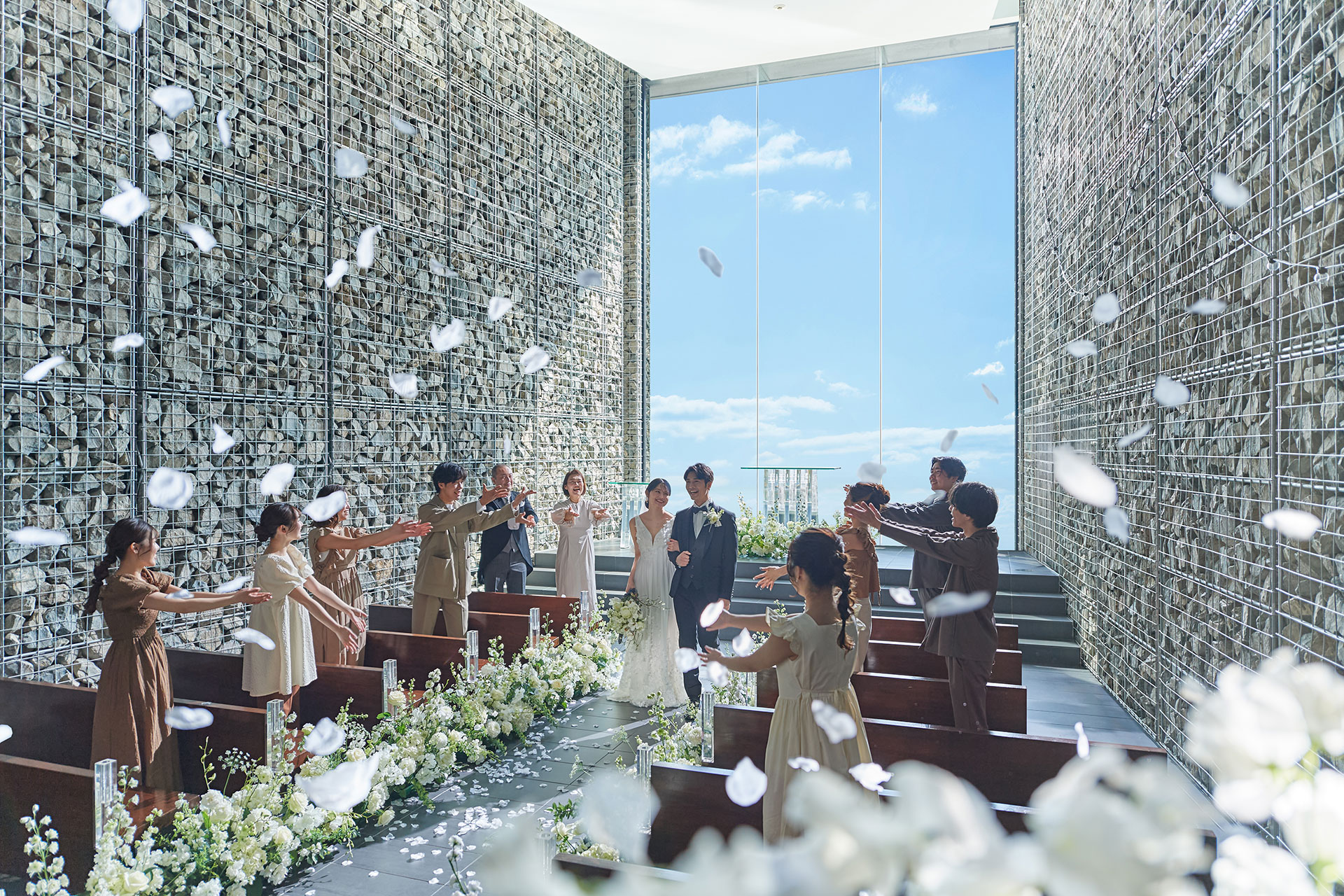 チャペル内に入った瞬間に目を奪われるのは、高天井のスケール感と御影石を積み上げた壁面、そして天空へ向かってのびるバージンロード。非日常のドラマティックなしつらえが、おふたりの旅立ちを祝福します。