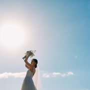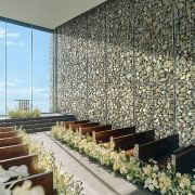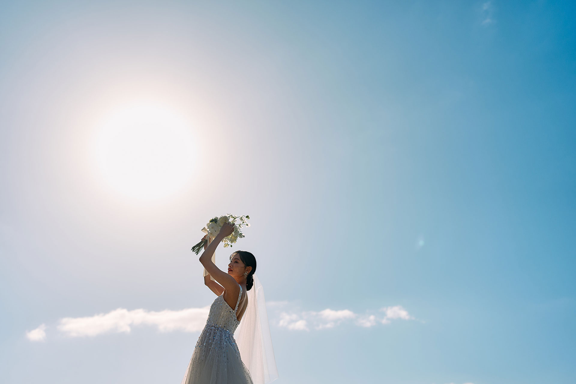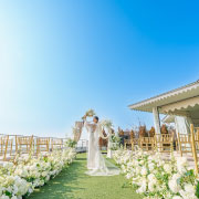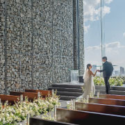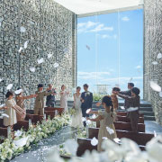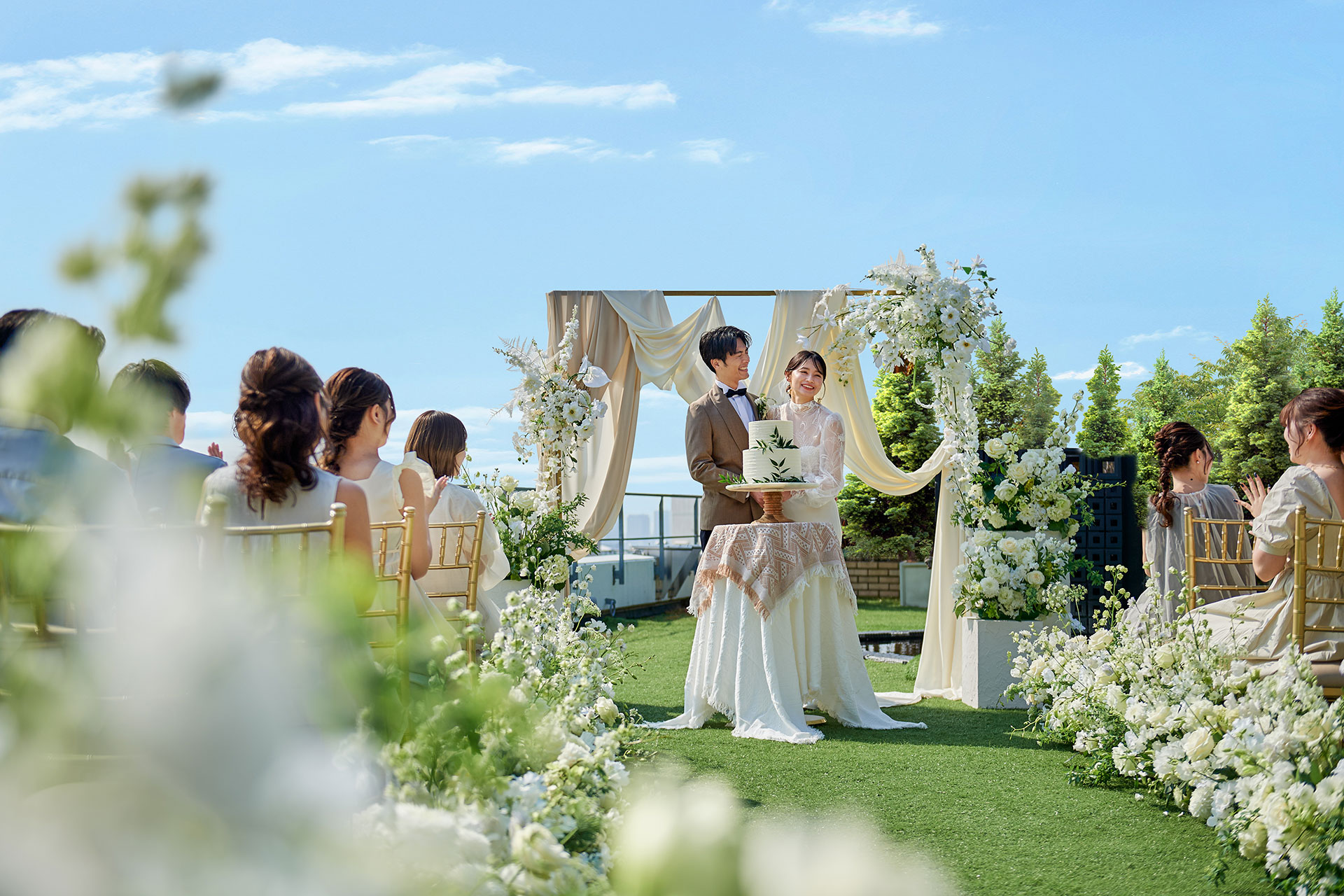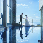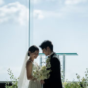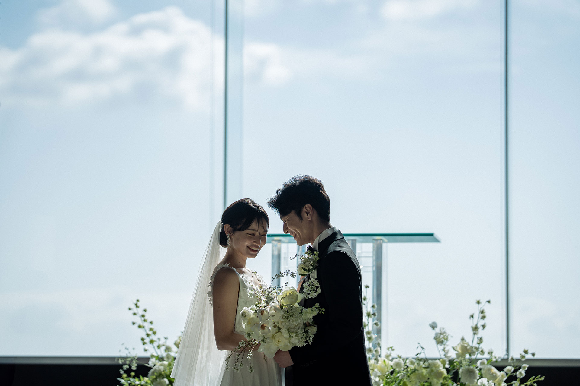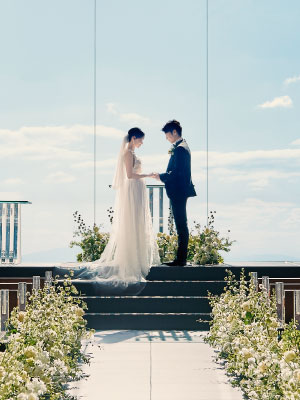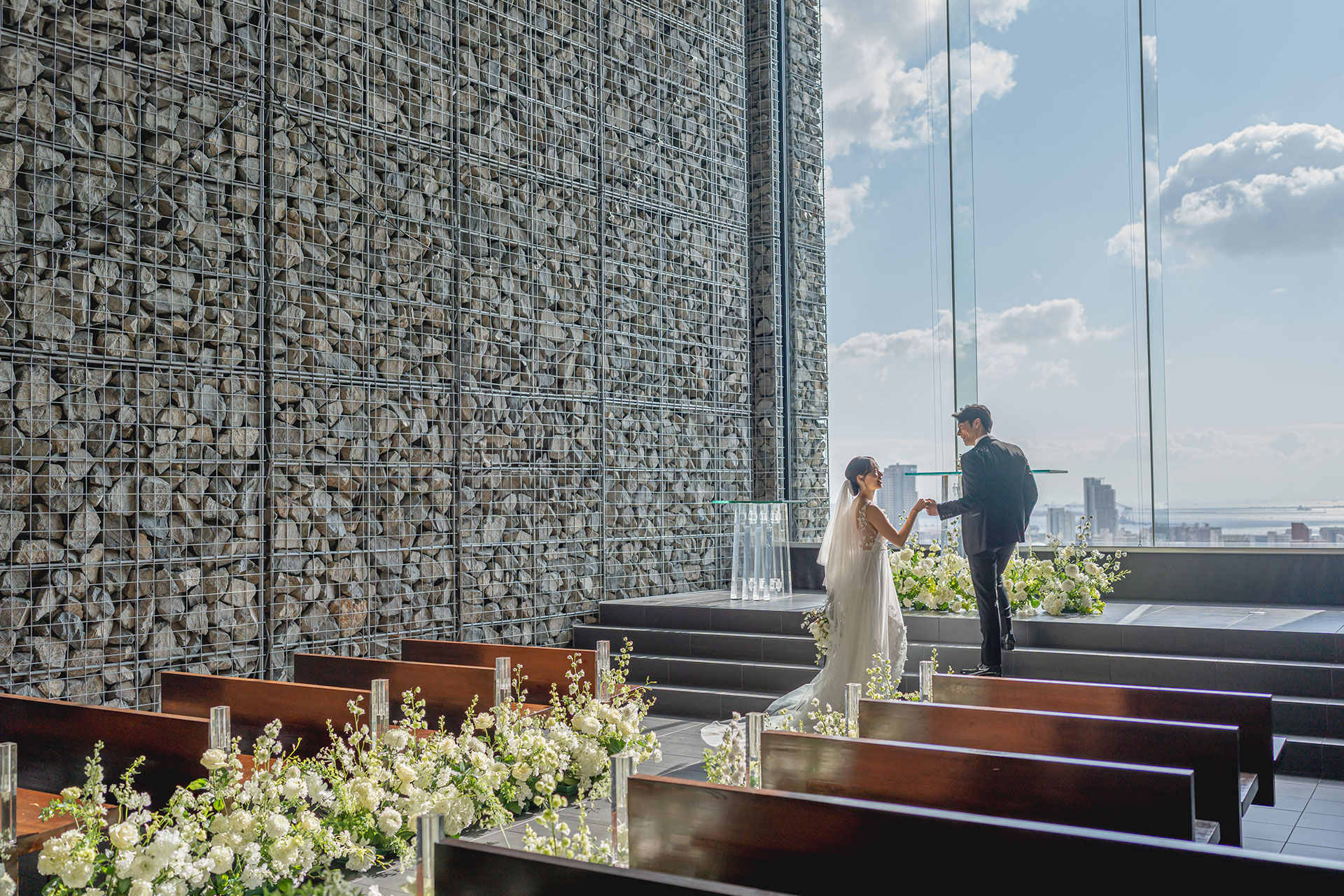 バージンロードを進んだ先には、一面のガラス窓越しに大空をのぞむ祭壇が。おふたりが立つと、その姿はまるで空に浮かんでいるかのよう。降り注ぐ光も相まって、誓いのシーンがドラマティックな感動に包まれます。