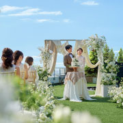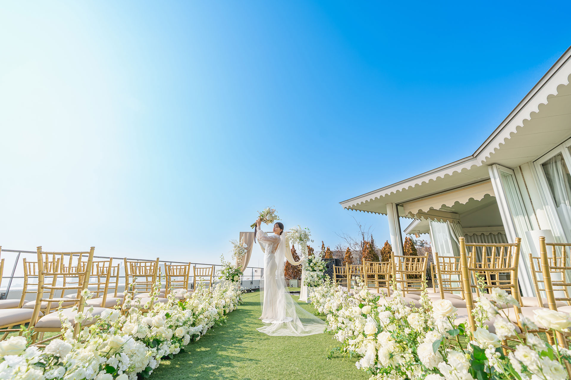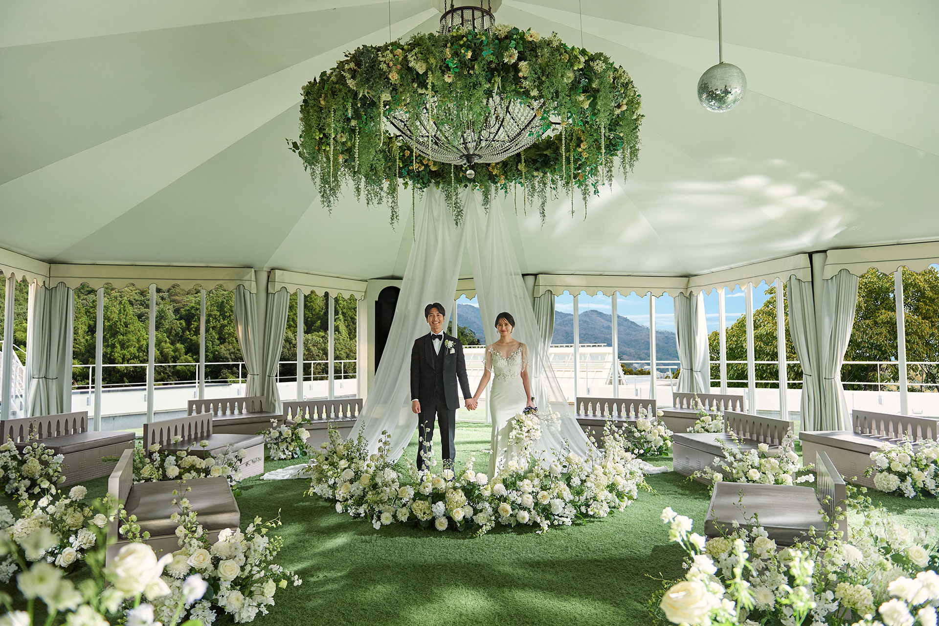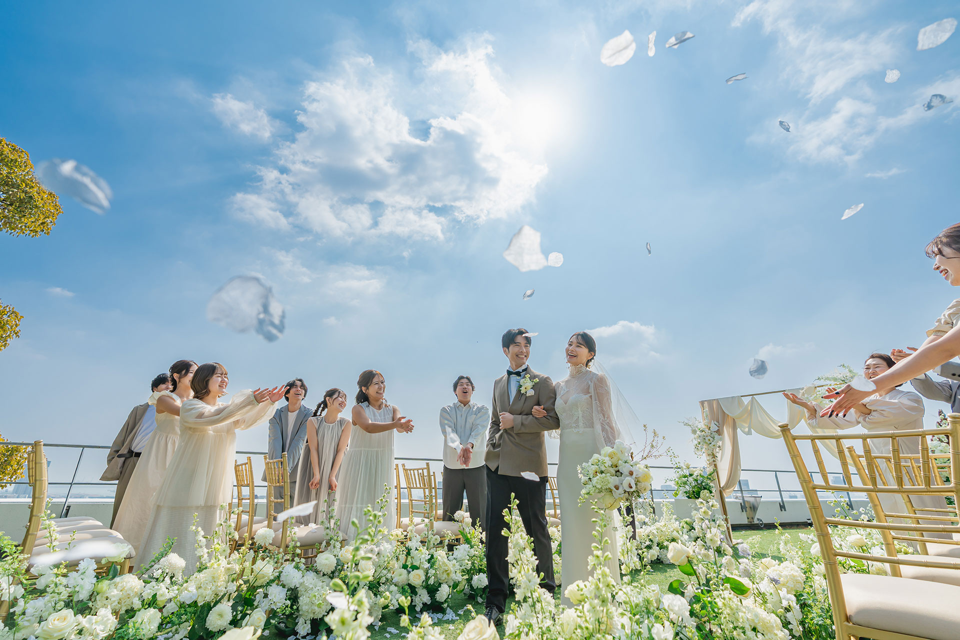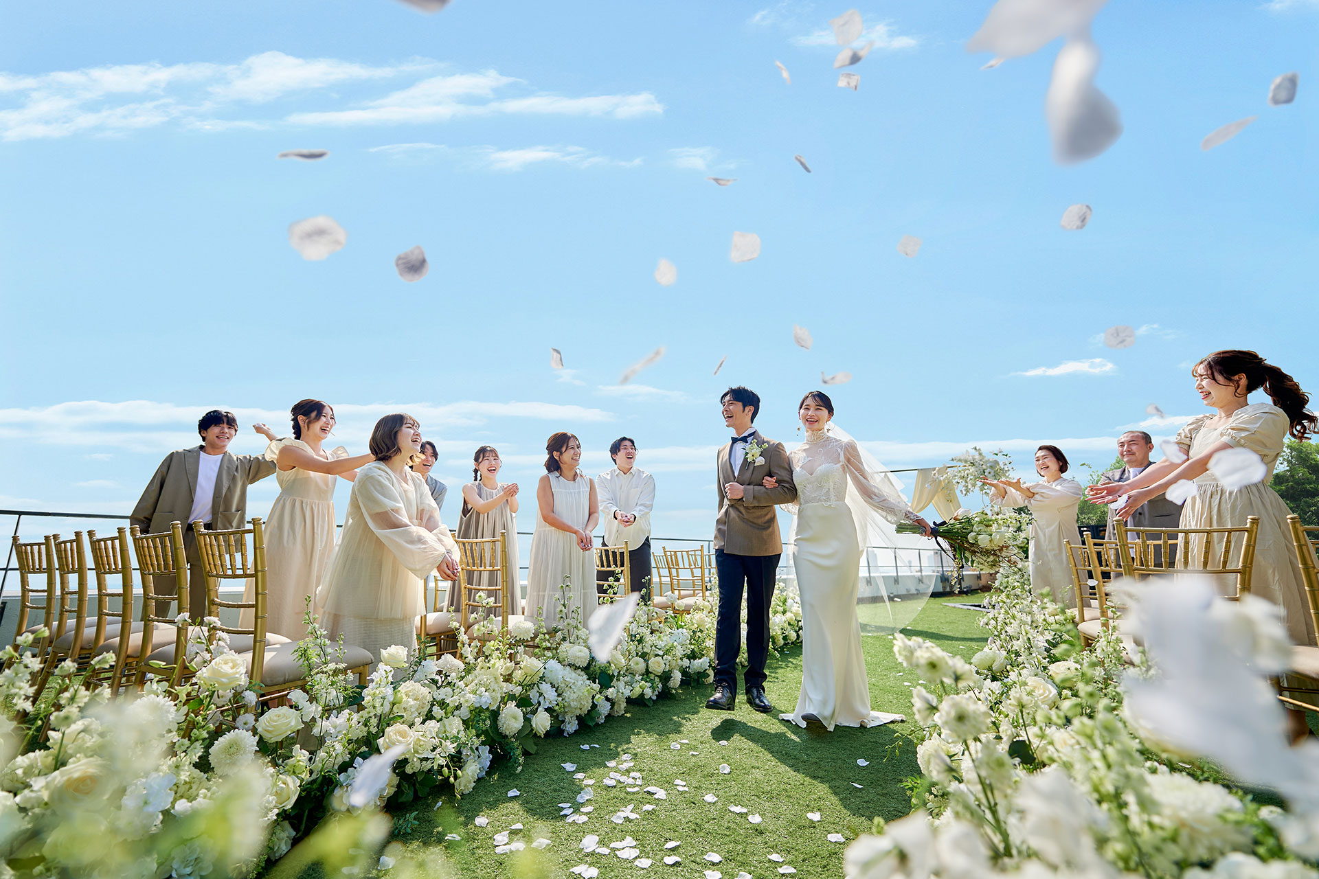 青空の下、神戸らしい圧巻の眺望が広がる屋上庭園「レトワール」。その時々に出会える緑、自然光、風が幸せの門出に立つおふたりを祝福します。プライベート感たっぷりのこの場所で、家族やゲストに囲まれながら執り行う挙式は一生忘れられないものに。