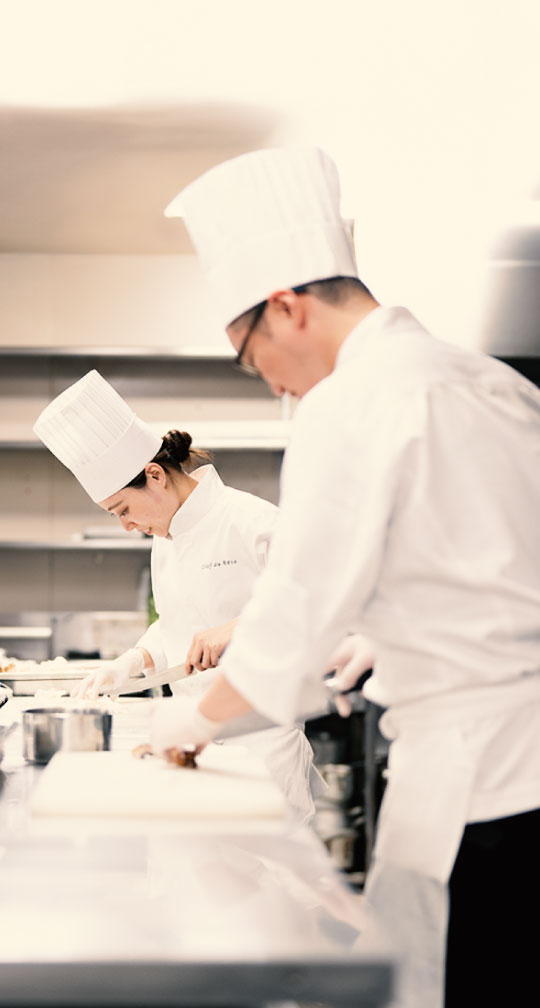 ウェディングで提供する料理は、おふたりのおもてなしの心を表現するためのもの。だからこそ、挙式当日に向け、さまざまな食材の旨みを凝縮した出汁を取るところから仕事を始めます。時間と手間を惜しまず、丁寧に。そして、その日に出会える最高のオリジナルコースを提供できるよう、愛情を注ぎながら仕込んでいく。それが、私たちの揺る気ない信念であり、約束です。