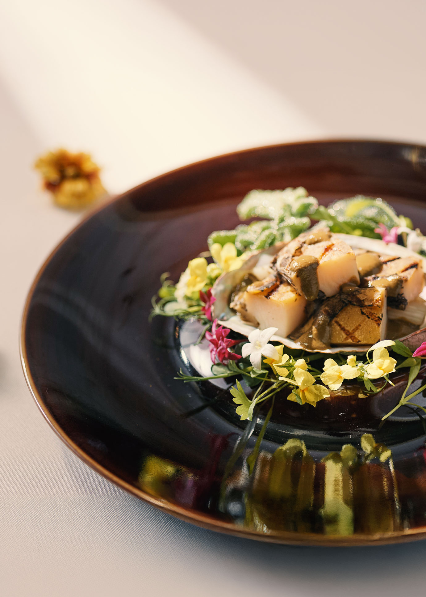淡路や瀬戸内で水揚げされた新鮮な魚介類や神戸牛、旬の野菜など、兵庫の地元食材をシェフ自ら厳選。繊細かつ美しいひと皿は、一切の妥協を許さない姿勢から生まれます。