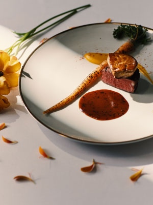 淡路や瀬戸内で水揚げされた新鮮な魚介類や神戸牛、旬の野菜など、兵庫の地元食材をシェフ自ら厳選。繊細かつ美しいひと皿は、一切の妥協を許さない姿勢から生まれます。