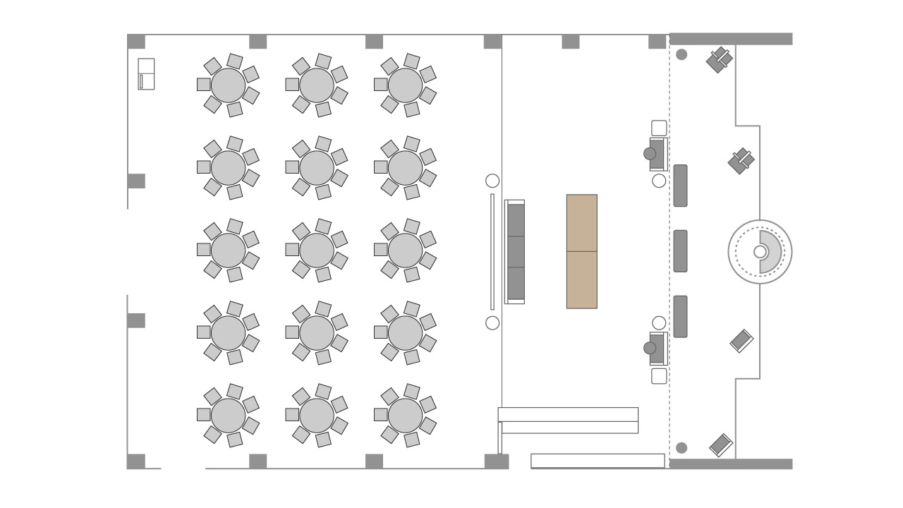 An expansive banquet space that can accommodate an elegant party of 140 guests in a relaxed atmosphere
