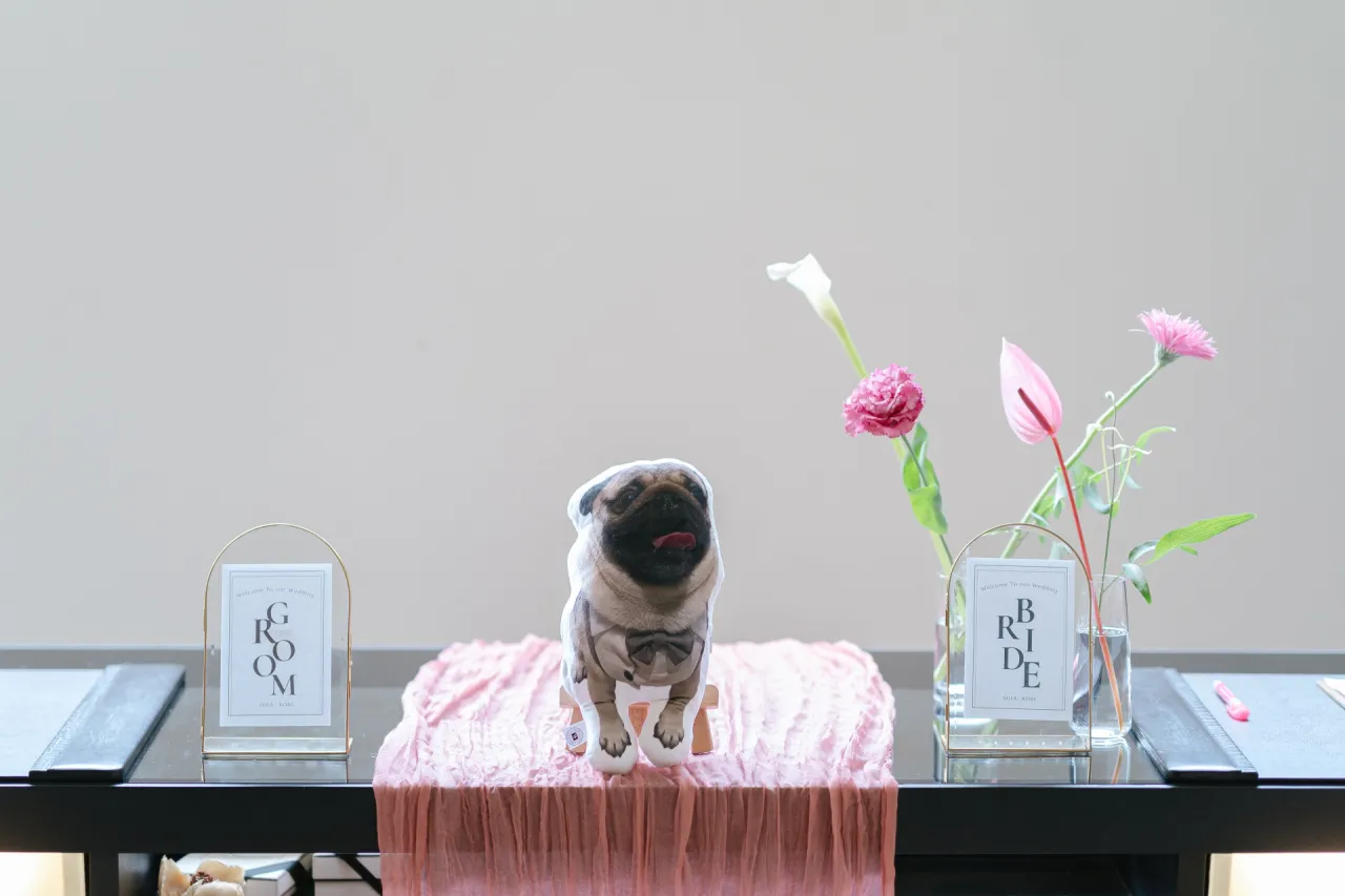 新婦はウェルカムスペースに飾っていた愛犬のぬいぐるみを使ったトスイベントで会場を和ませ