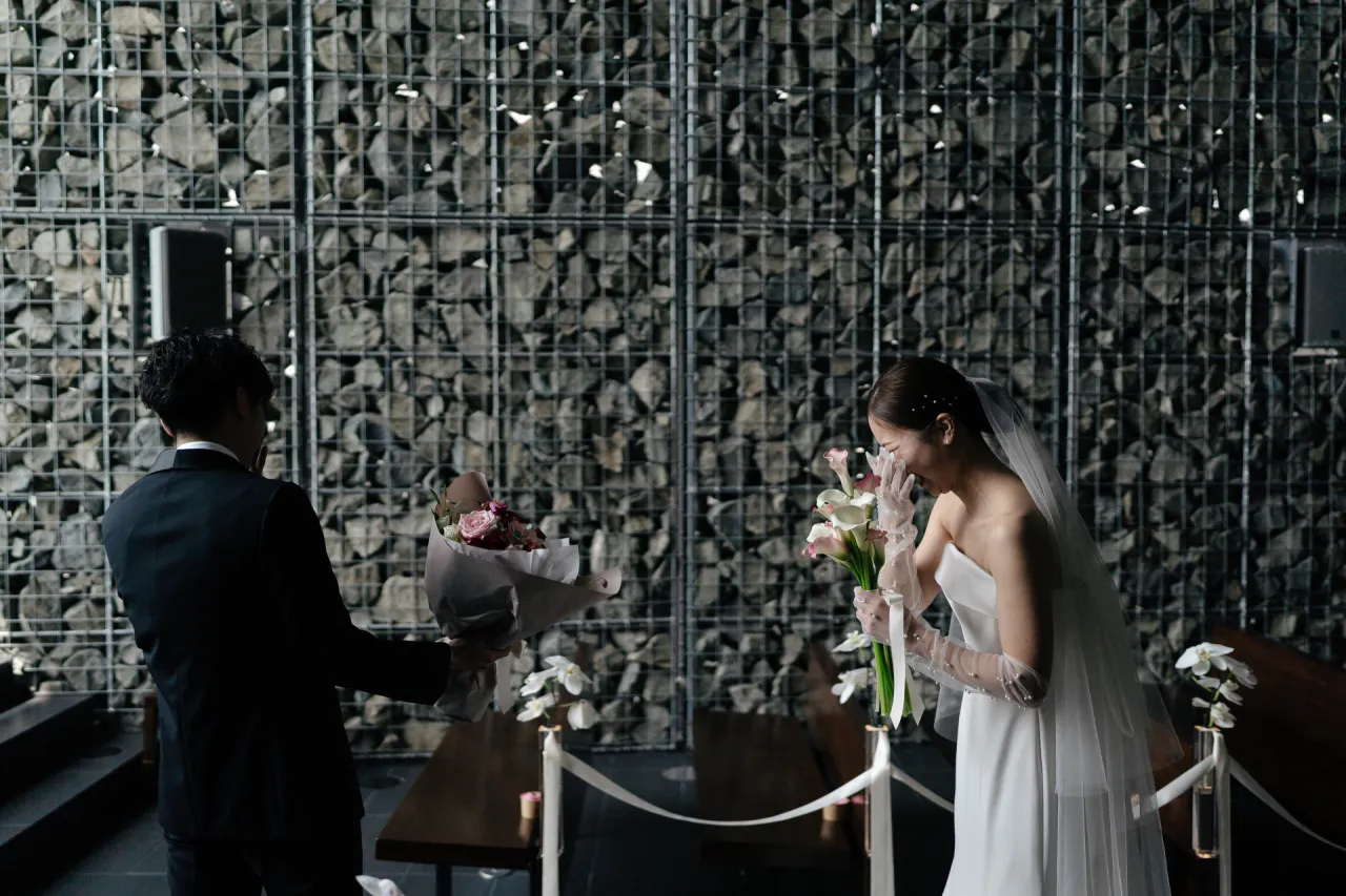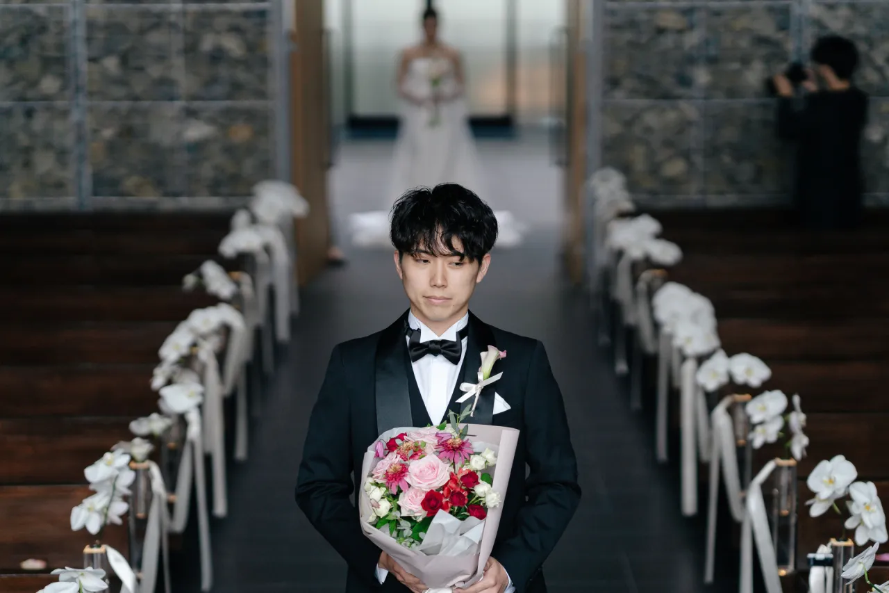 新郎は新婦へのサプライズとして、感謝の想いを込めた花束を内緒でご用意。