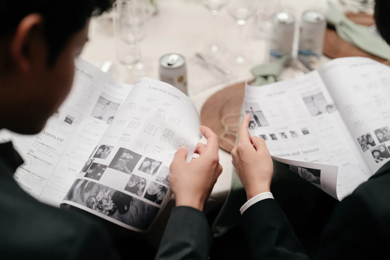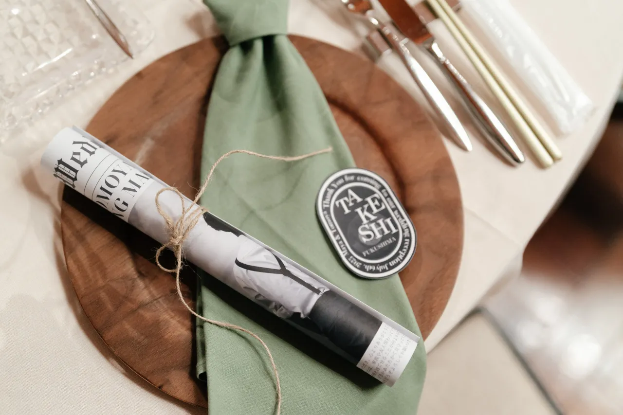 おふたりがこだわって制作した新聞紙風プロフィールペーパーを巻物に仕立て、