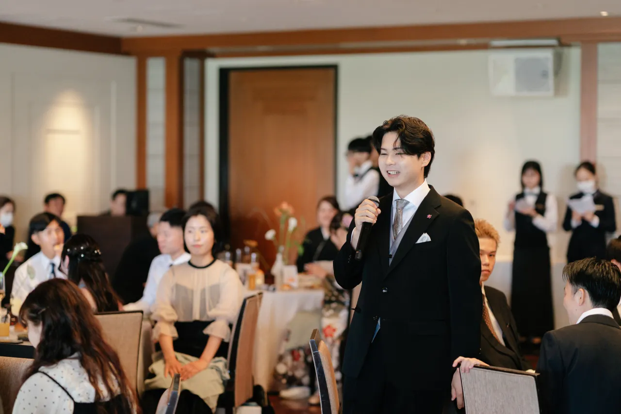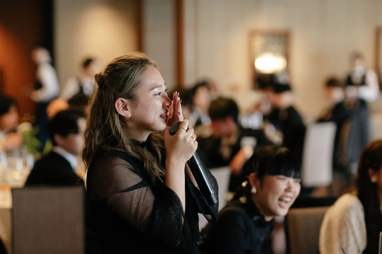 スピーチの代わりに「いろんな方の声を聞きたい」という想いから、数名に突撃インタビューを実施。ダンスの先生やご友人など大好きな方々からのメッセージに新婦は涙されました。