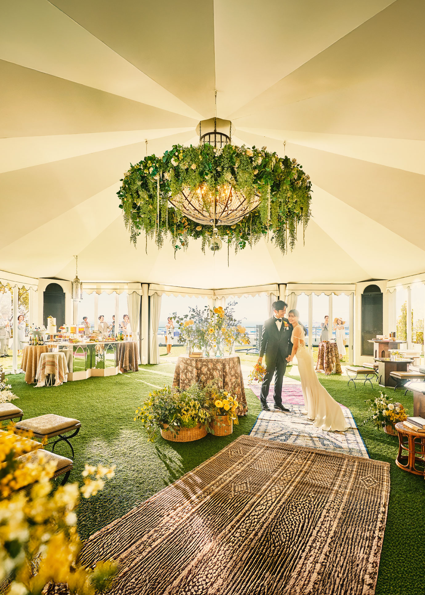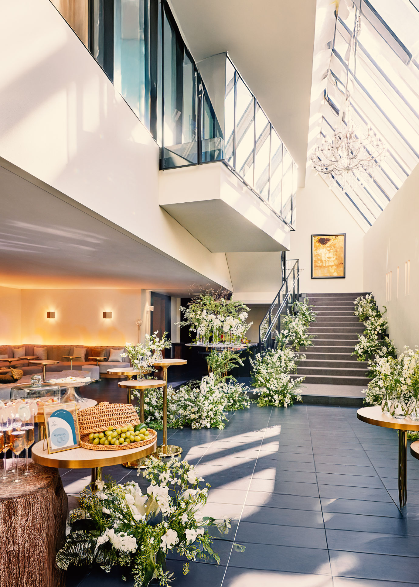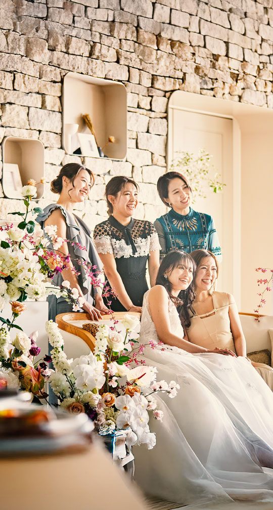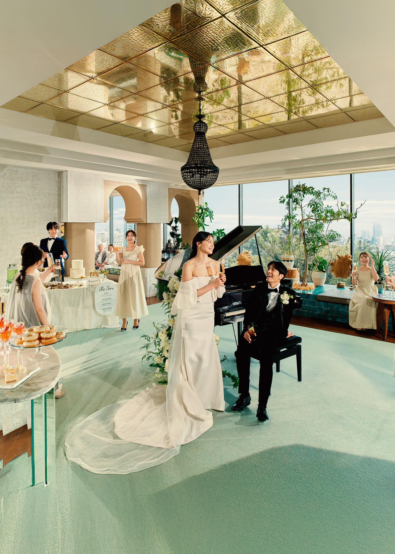 階段から登場するおふたりをゲストの温かな拍手と歓声が迎えます。その後は、やわらかな自然光に包まれながら、お一人おひとりとおしゃべりを楽しんで。誰もがいつもの笑顔になり、これから始まるパーティへの期待感もぐっと高まるはず。
