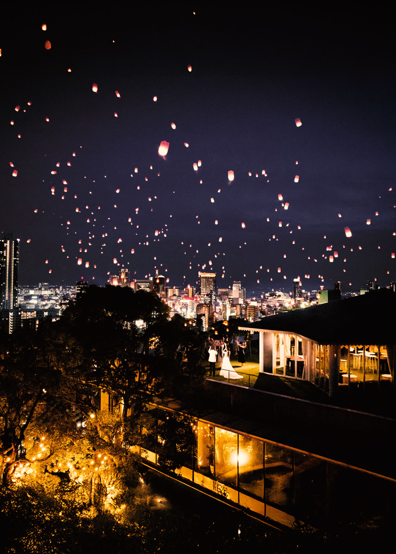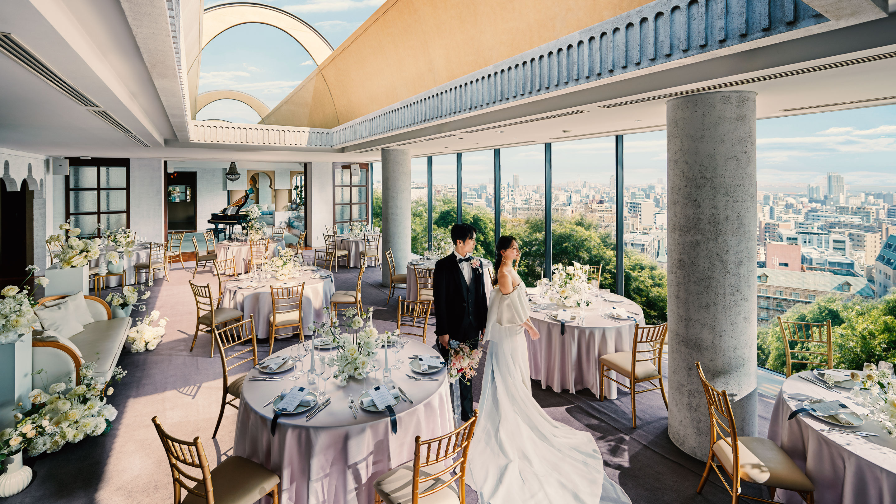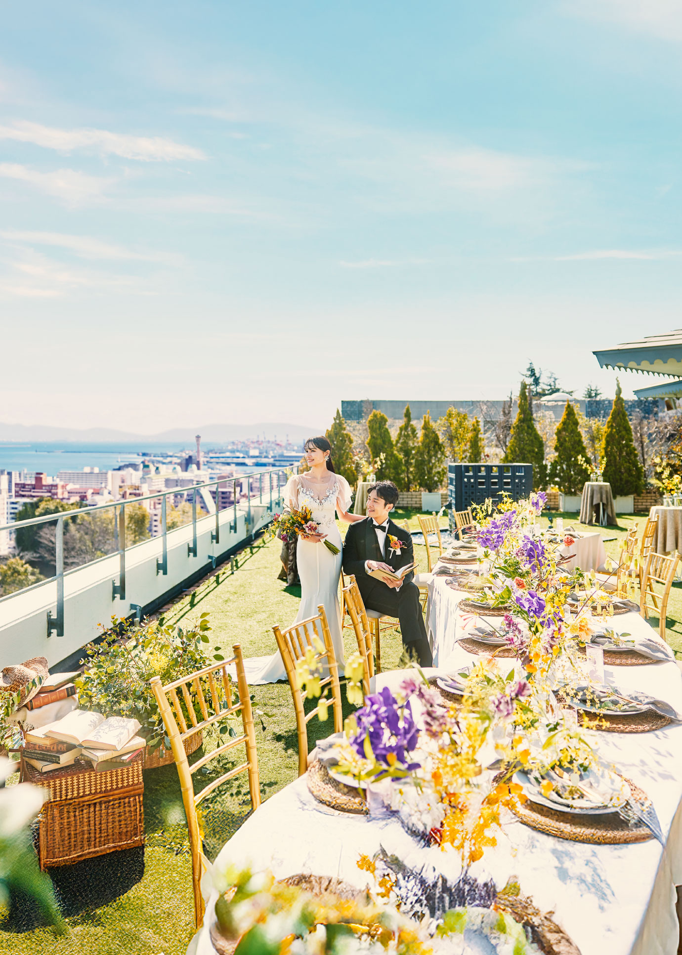 そして、披露宴の演出の幅を広げるのが、秘密の通路を通って向かう屋上庭園のレトワール。目の前に広がる神戸の山と海のパノラマビューが、ゲストを驚きと高揚で包みます。ここで叶えるバルーンリリースやデザートタイムはきっと忘れられないシーンに。