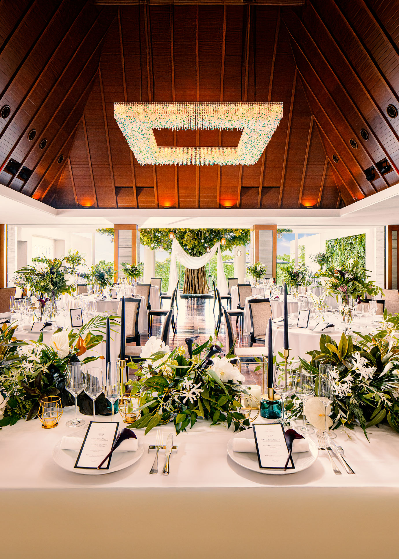 シャンパンゴールドを基調にしたノーブルな空間がゲストをお出迎え。吹き抜けのガラス天井にきらめくシャンデリアと自然光のコントラストがパーティをより印象的なひと時に演出します。