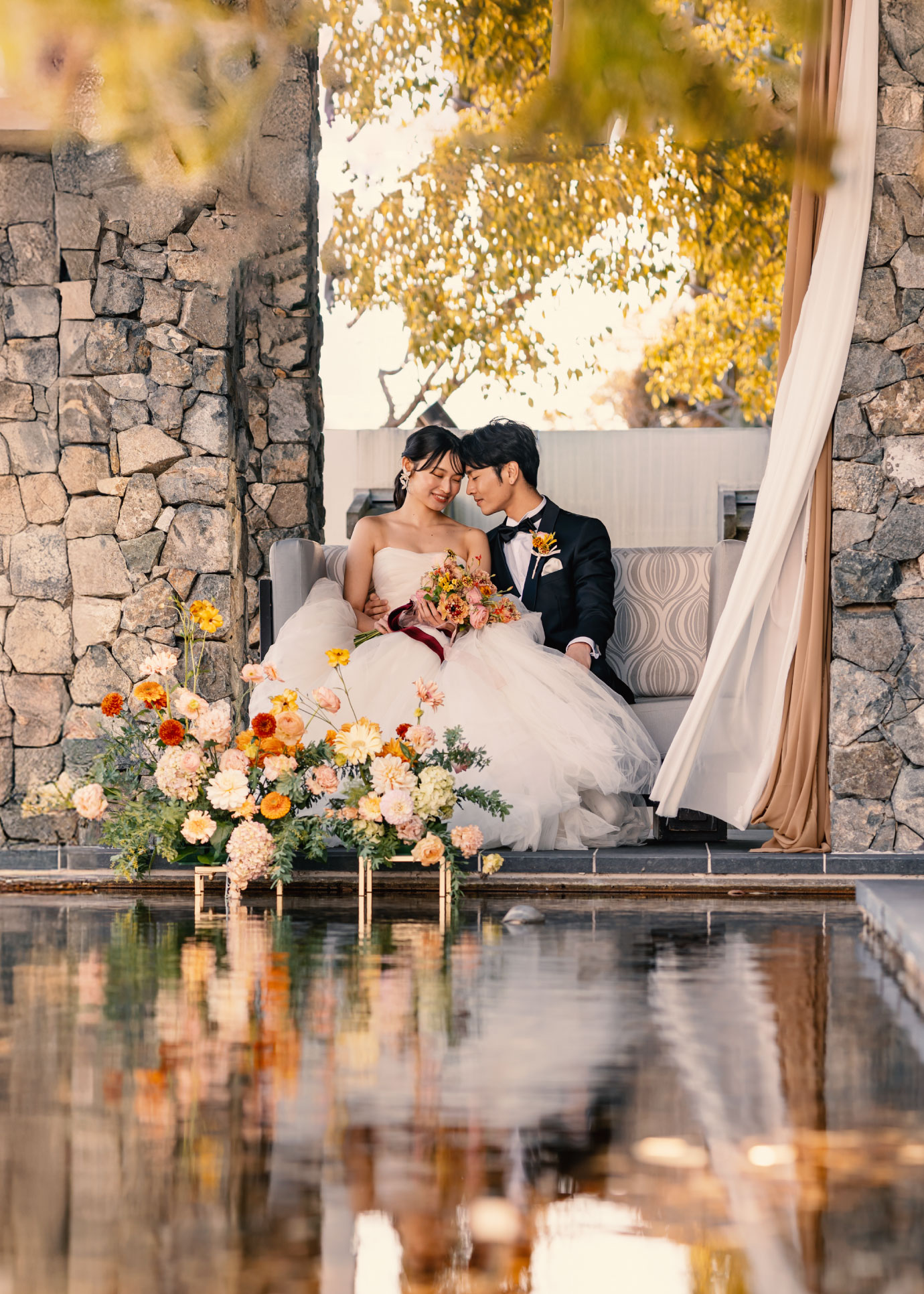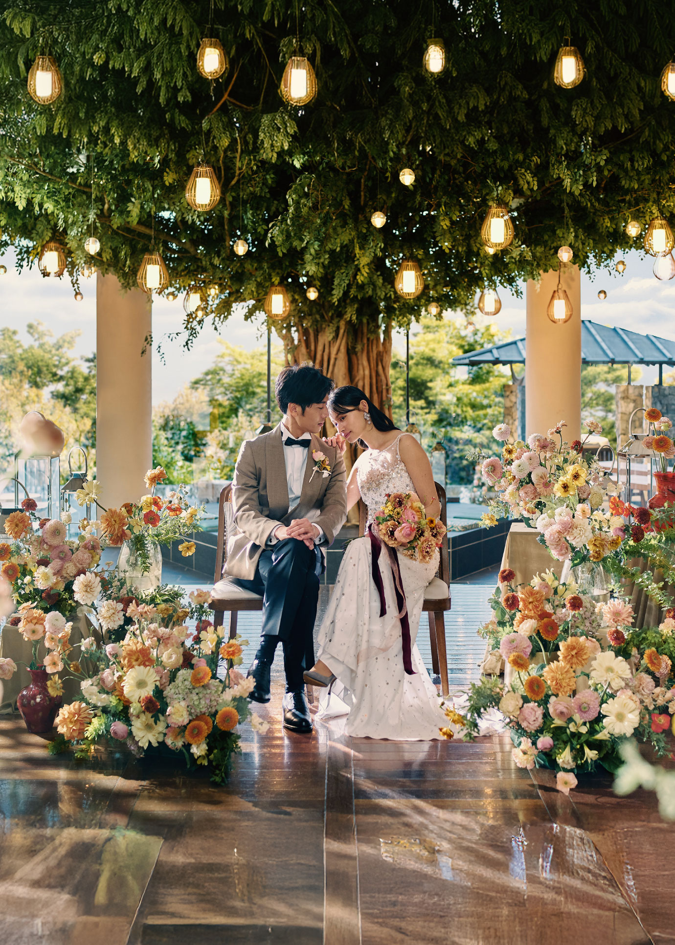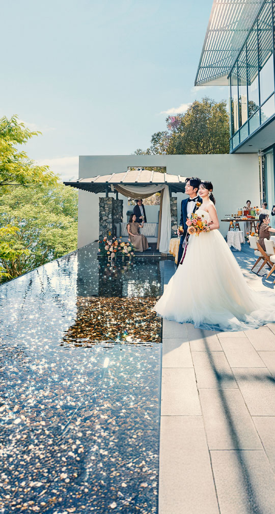 隣接のテラスに出ると、心地よい水音が響くウォーターコテージが。このスペースももちろん、当日おふたりだけの貸切となります。お好みのアイテムを飾り、異国のリゾートで過ごす感覚のゆったりで温かなパーティをお楽しみください。