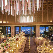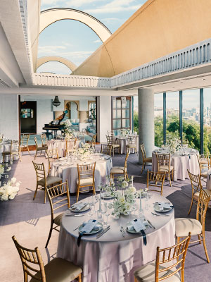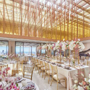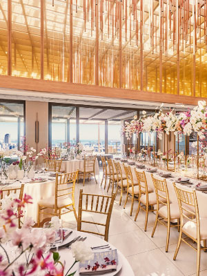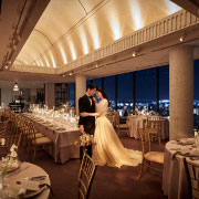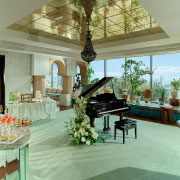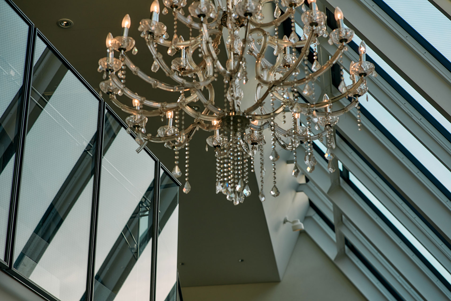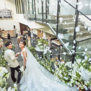 シャンパンゴールドを基調にしたノーブルな空間がゲストをお出迎え。吹き抜けのガラス天井にきらめくシャンデリアと自然光のコントラストがパーティをより印象的なひと時に演出します。