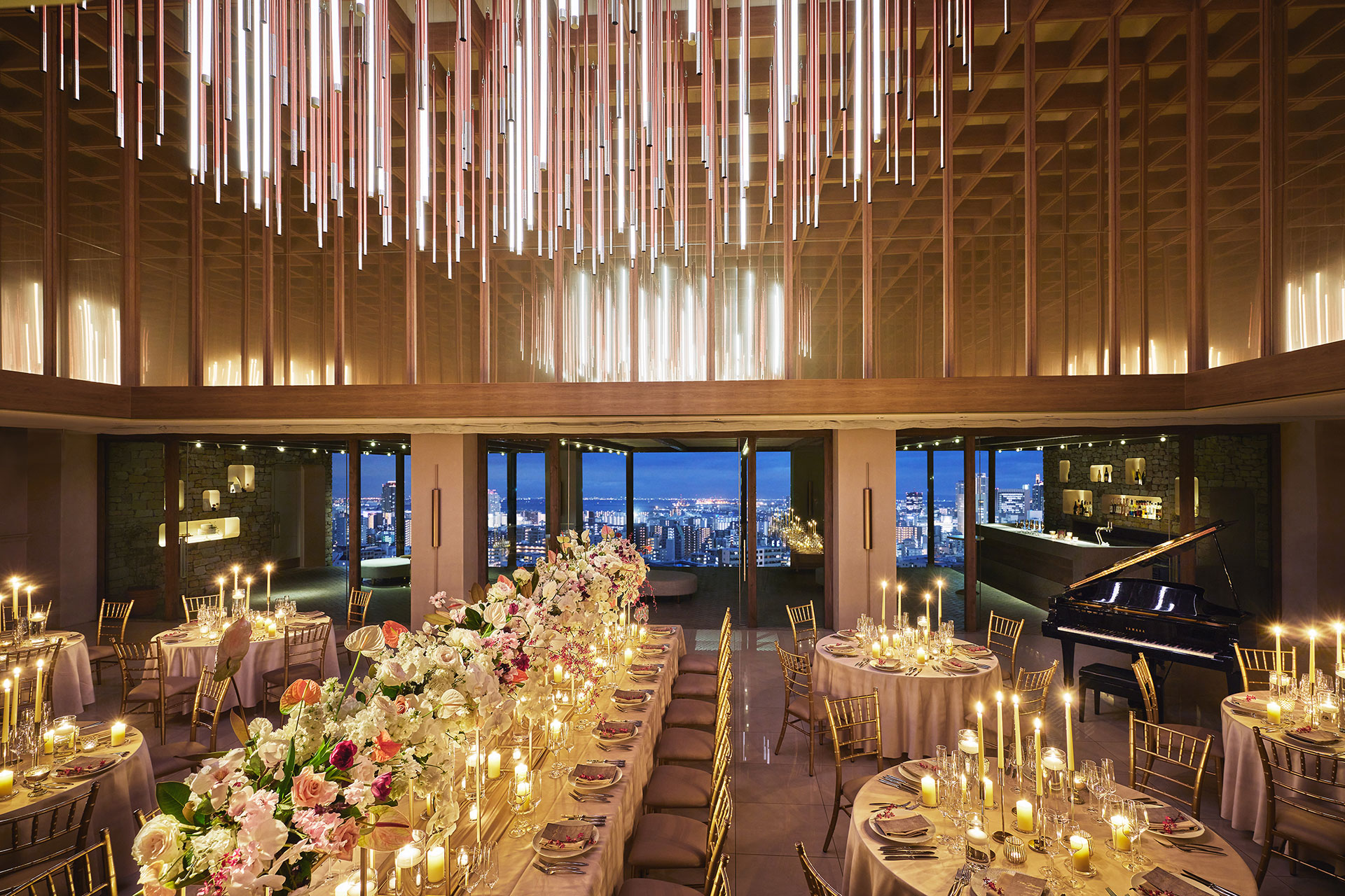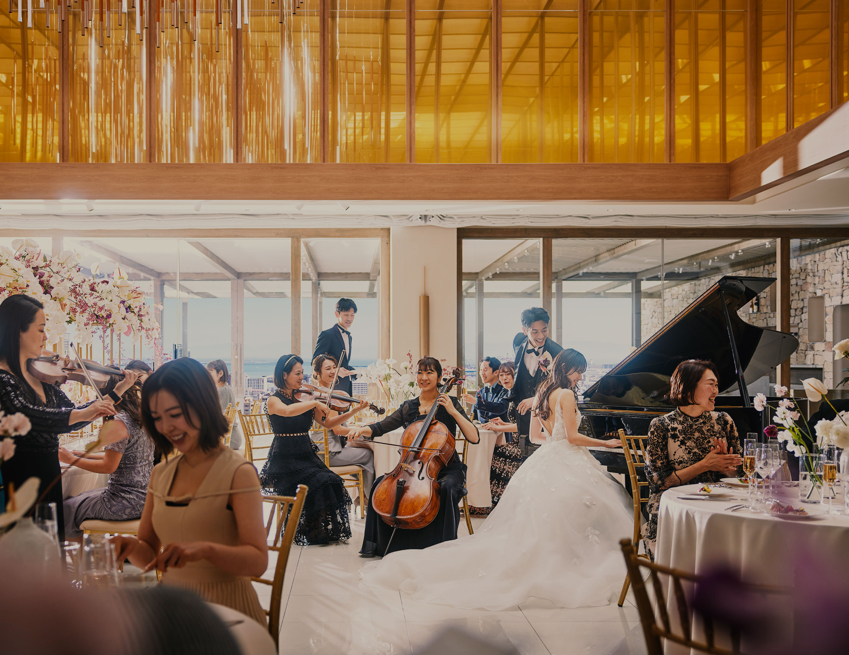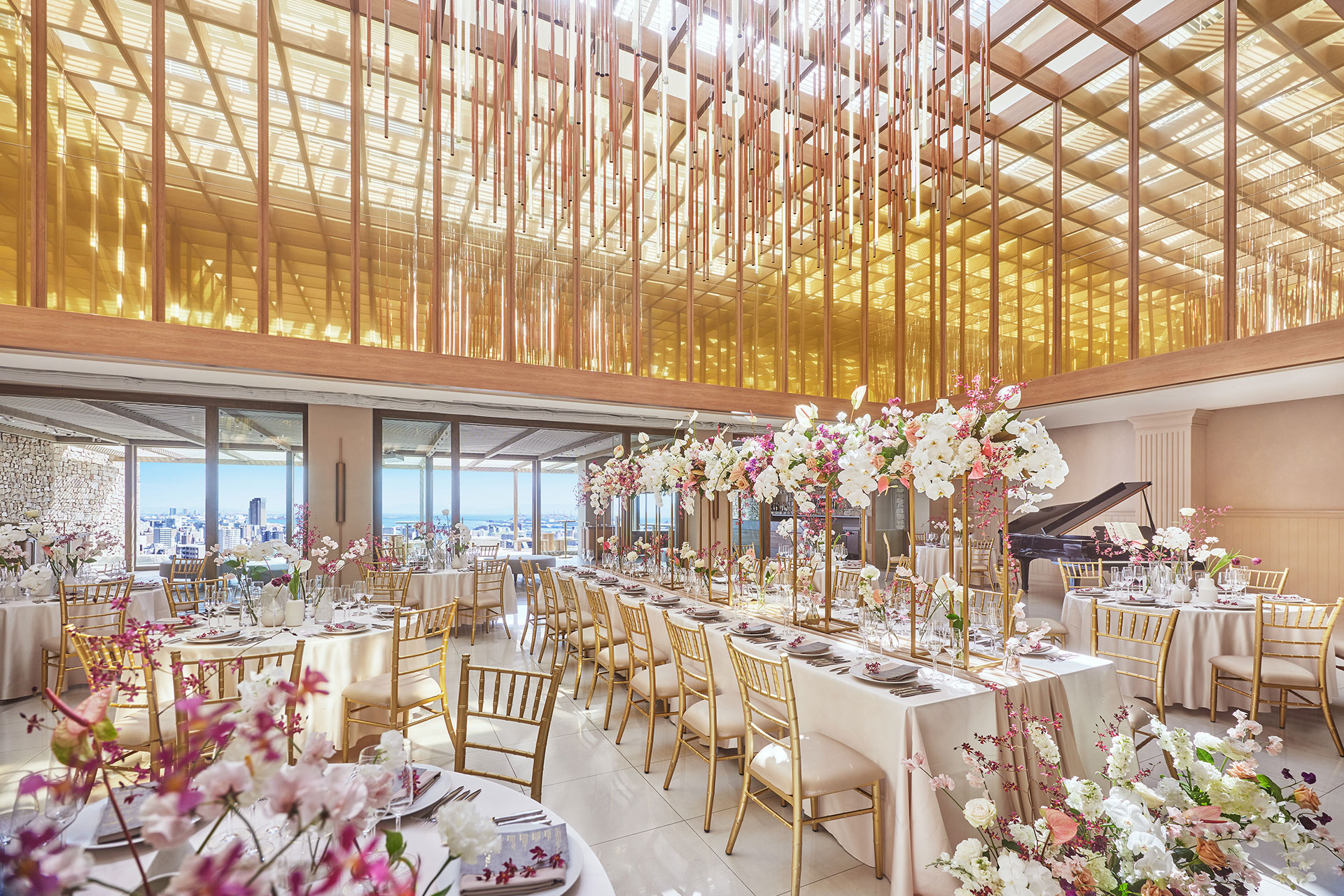 吹き抜けの天井からあふれんばかりに降り注ぐ自然光とシャンデリアの光に包まれる開放感はここならでは。神戸の絶景を望む全天候型ガーデンも相まって、記憶に残るひと時になるはずです。