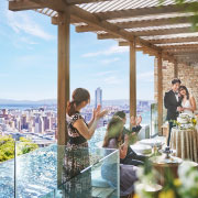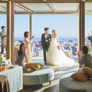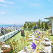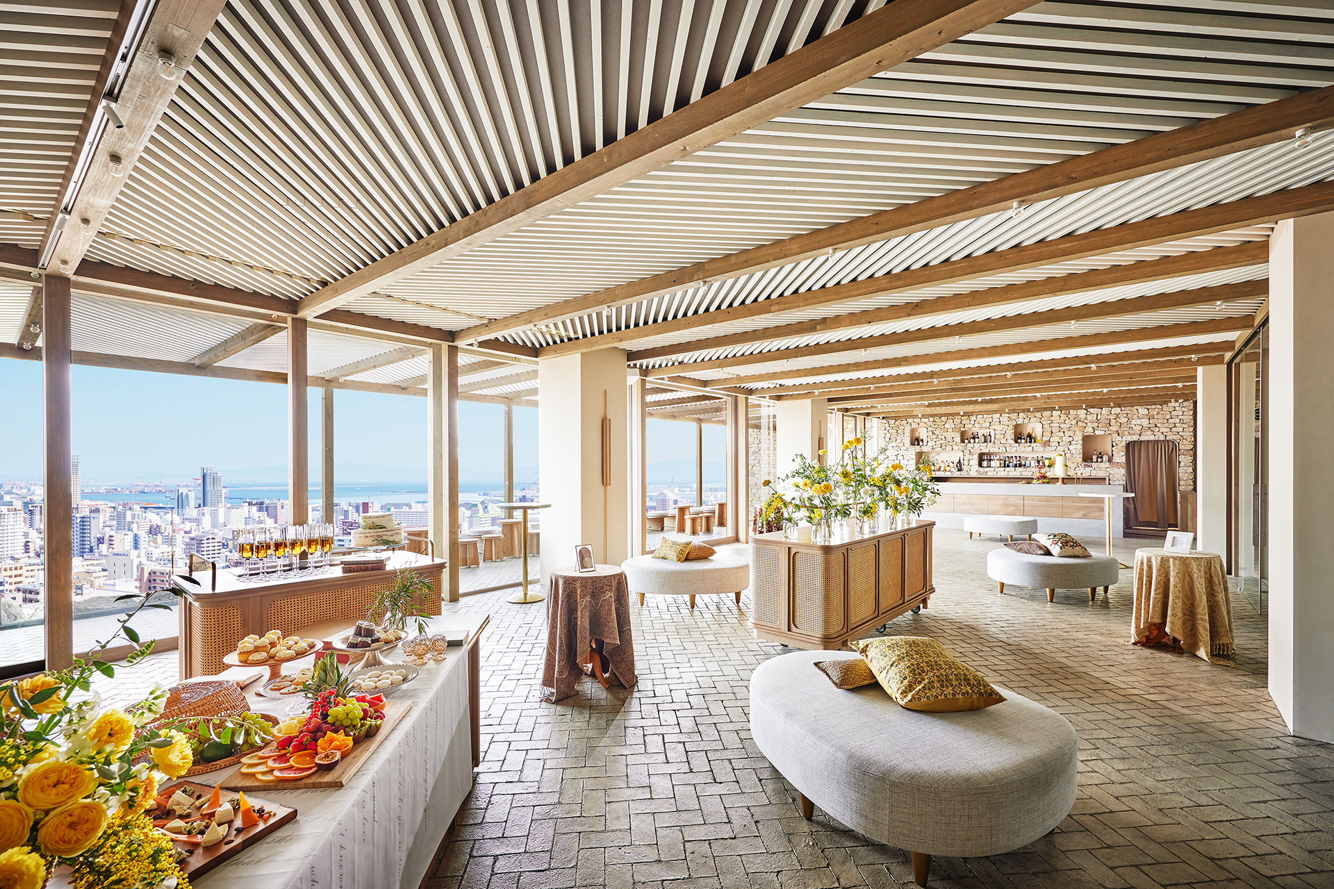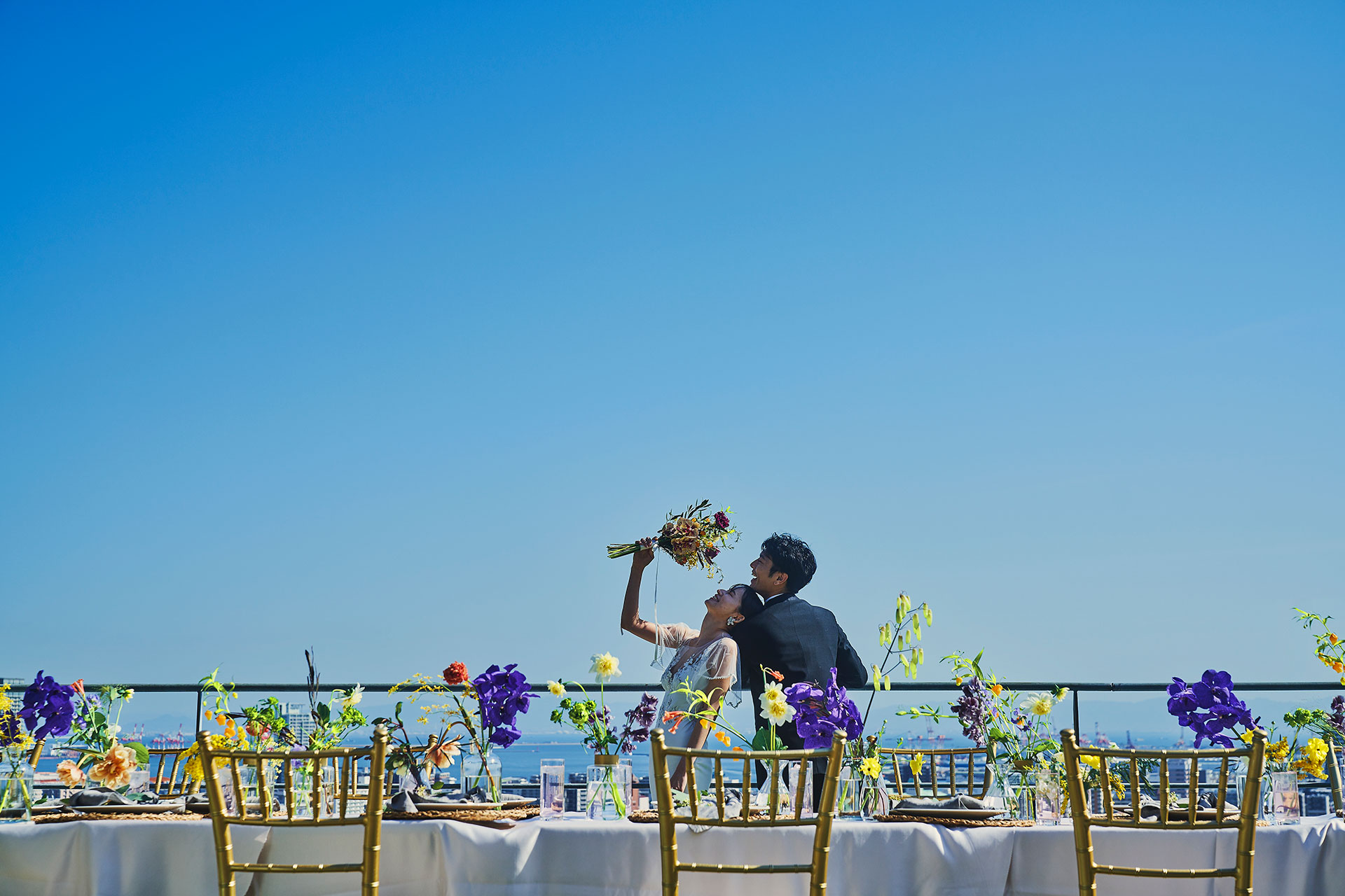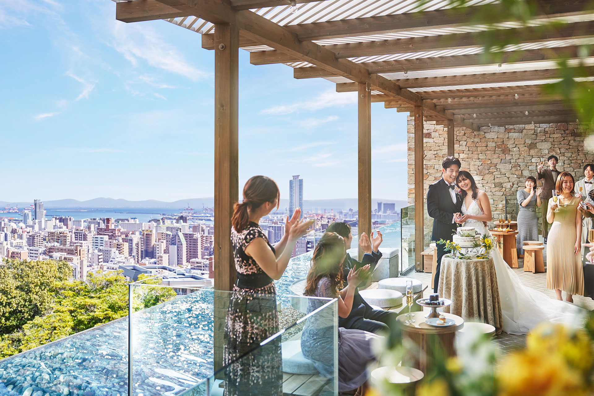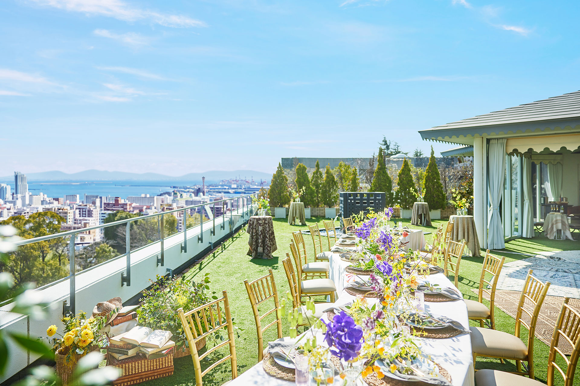 そして、披露宴の演出の幅を広げるのが、秘密の通路を通って向かう屋上庭園のレトワール。目の前に広がる神戸の山と海のパノラマビューが、ゲストを驚きと高揚で包みます。ここで叶えるバルーンリリースやデザートタイムはきっと忘れられないシーンに。