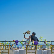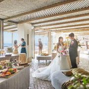 水辺に浮かぶテラスはオープンエアの心地よさ。天気の良い日には、宝石のように輝く海と遠くの山並みを見渡すことができます。撮影はもちろん、おもてなしのスペースとしてご活用ください。