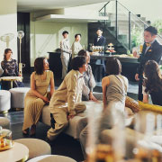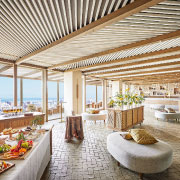 アイボリーの土壁と木の温もり、そして吹き抜けの天井に心解き放たれるダイニング。シンボルツリーやウォーターコテージなど、ゲストのワクワク感を誘う仕掛けにもご注目ください。