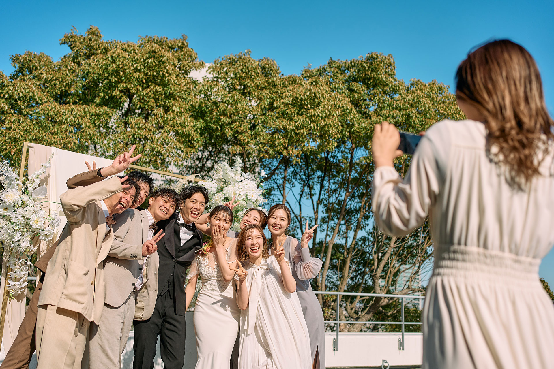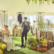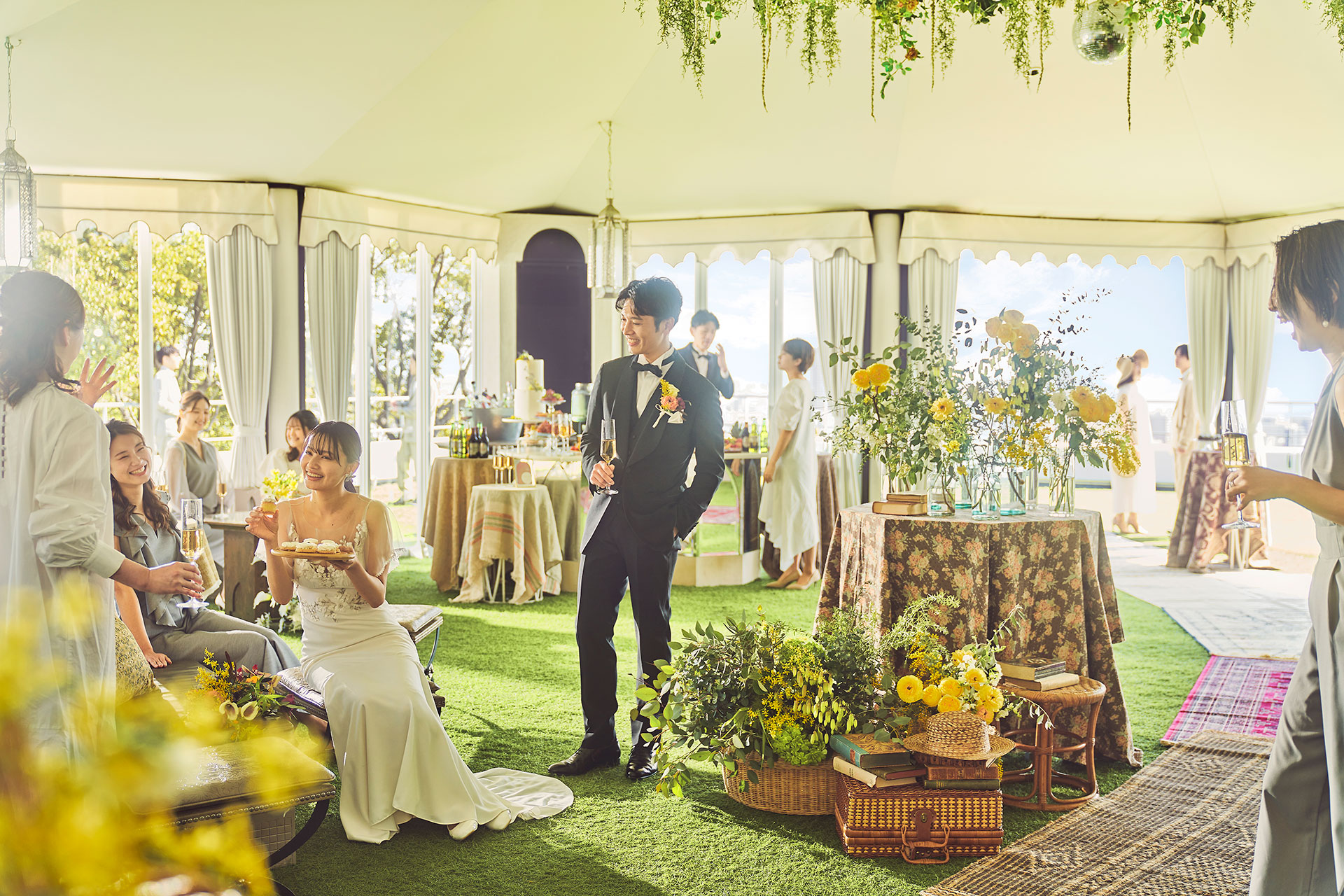 「天空の教会」での挙式後、披露宴開始までの時間をお過ごしいただくのは「ウェルカムパーク」。ゲストとの懐かしい写真を飾ったり、思い出のBGMをセレクトしたりと、空間を自由にアレンジして、おふたりがウェディングに込めた気持ちやテーマを表現することができます。
