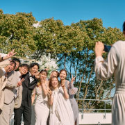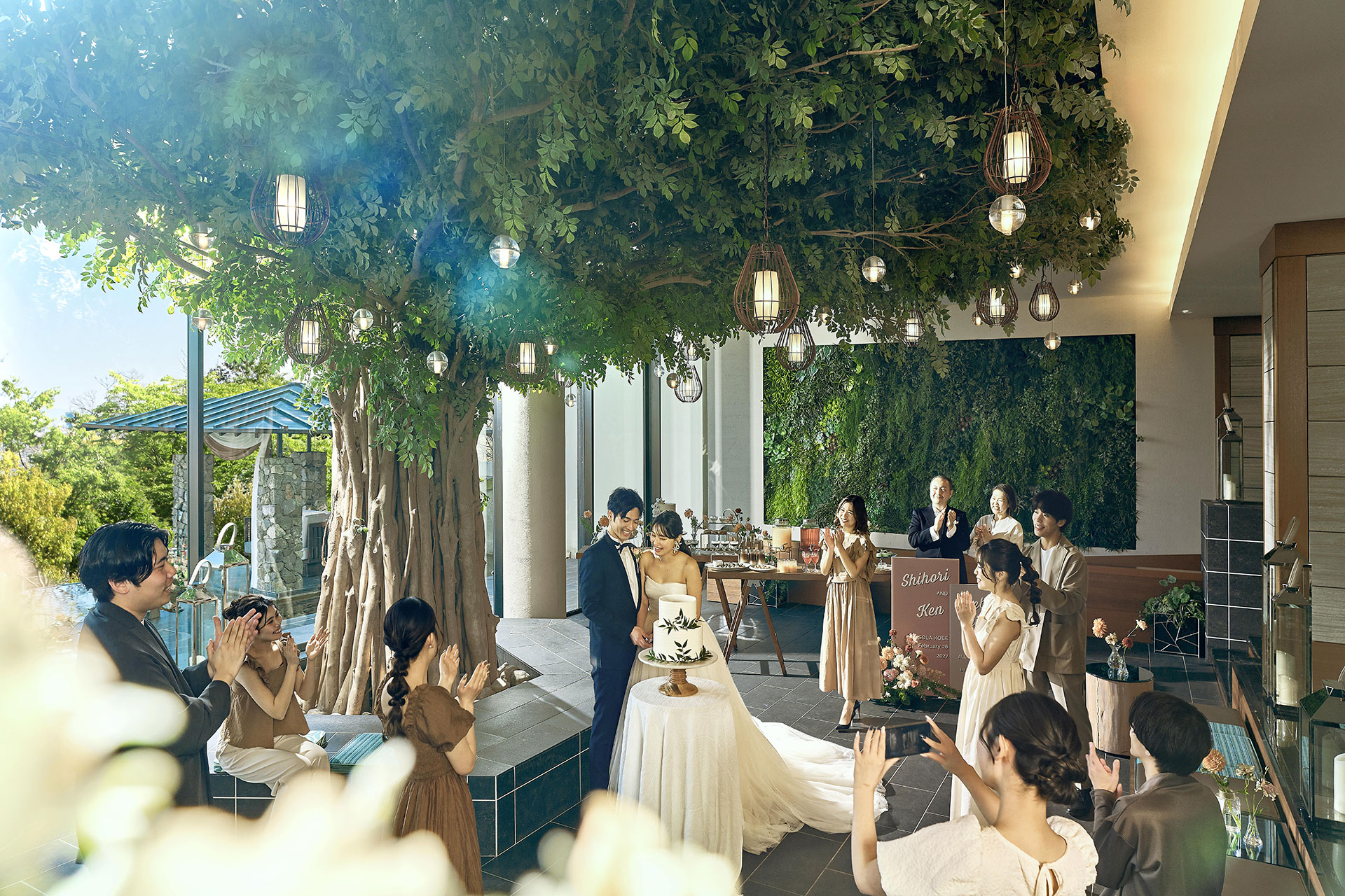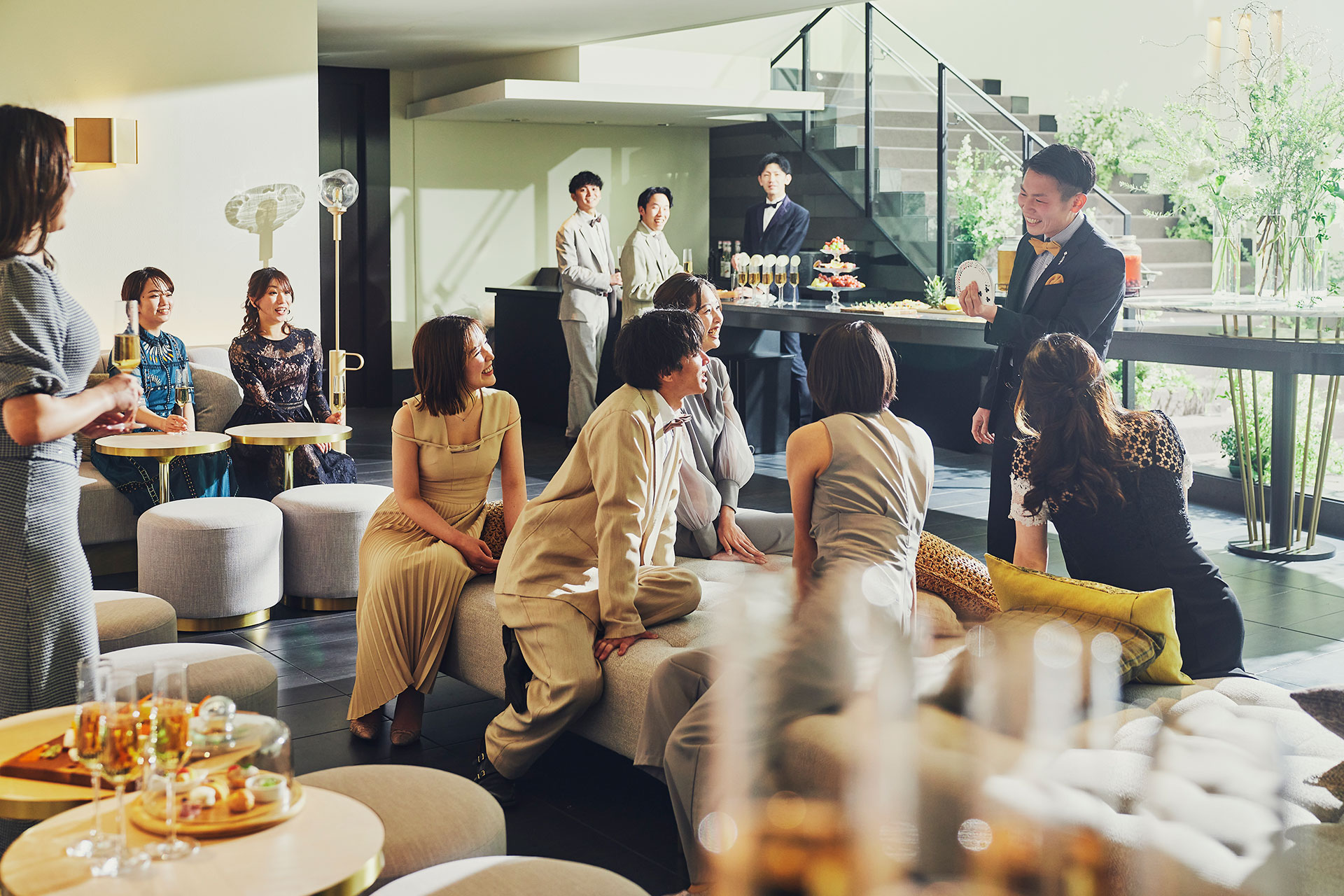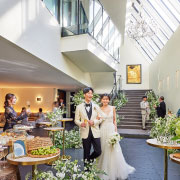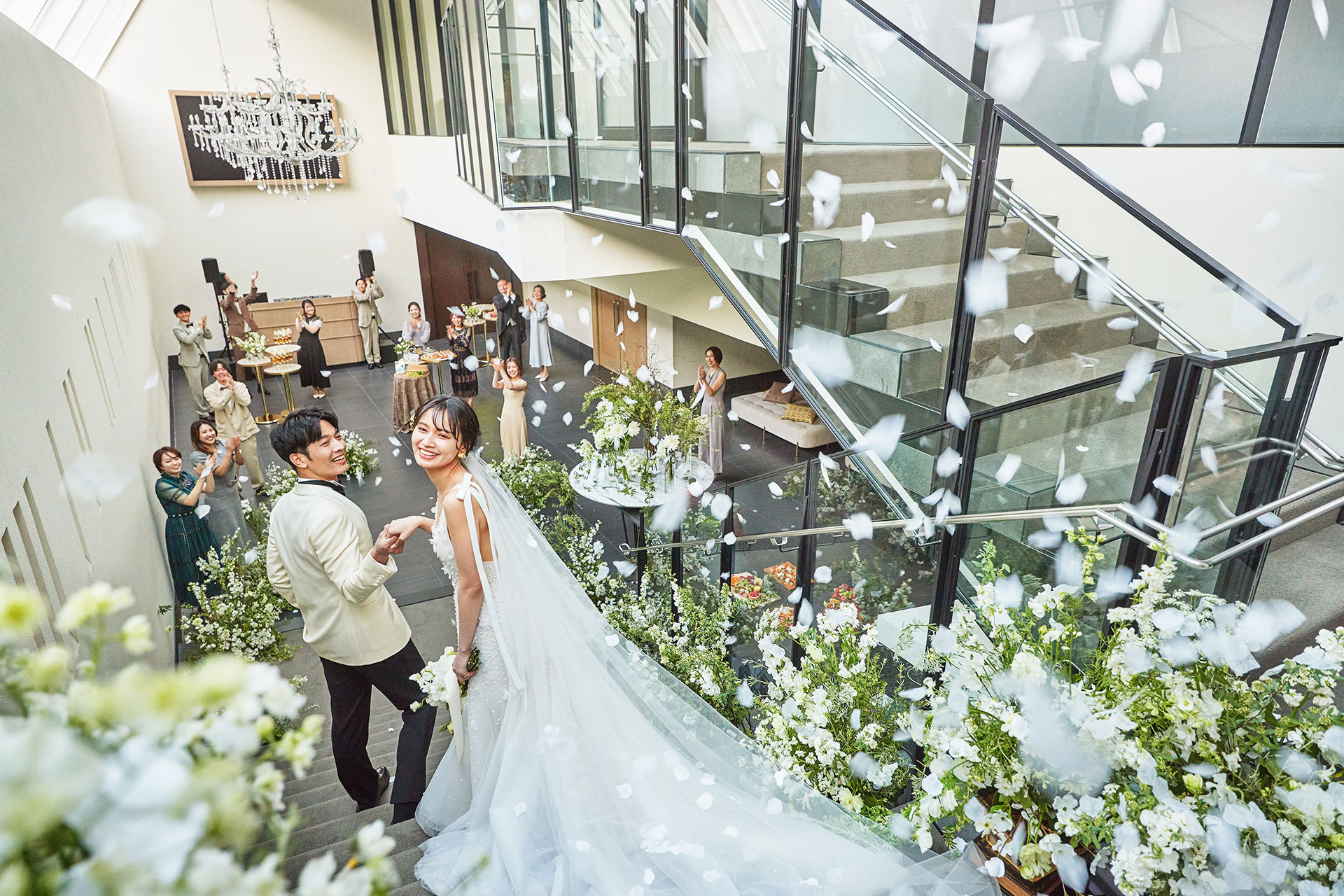 階段から登場するおふたりをゲストの温かな拍手と歓声が迎えます。その後は、やわらかな自然光に包まれながら、お一人おひとりとおしゃべりを楽しんで。誰もがいつもの笑顔になり、これから始まるパーティへの期待感もぐっと高まるはず。