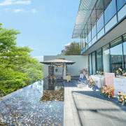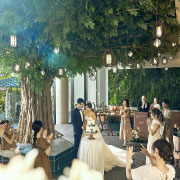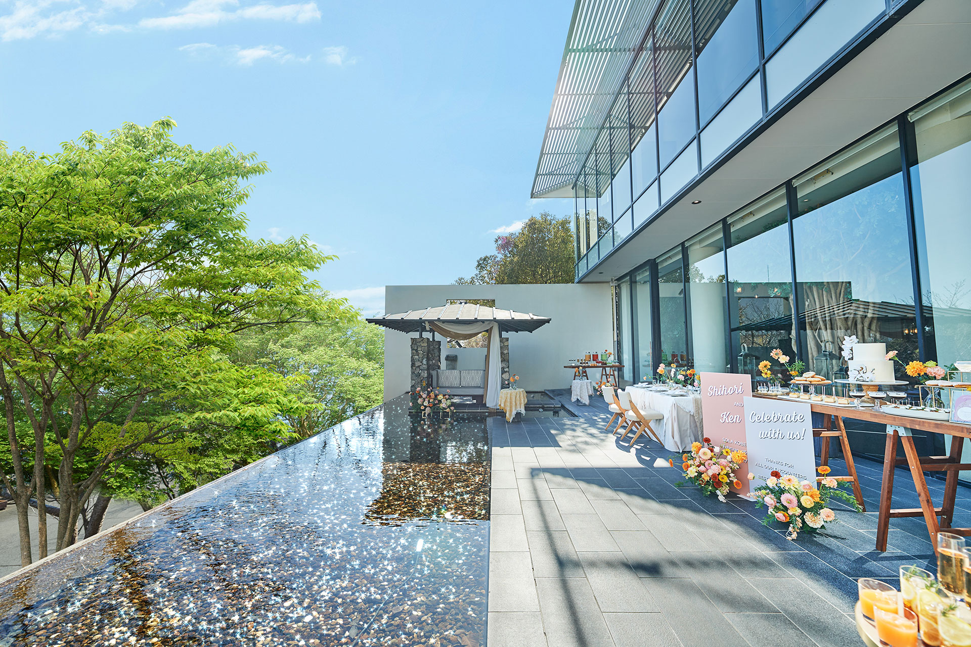 隣接のテラスに出ると、心地よい水音が響くウォーターコテージが。このスペースももちろん、当日おふたりだけの貸切となります。お好みのアイテムを飾り、異国のリゾートで過ごす感覚のゆったりで温かなパーティをお楽しみください。