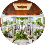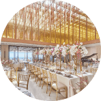 シャンパンゴールドを基調にしたノーブルな空間がゲストをお出迎え。吹き抜けのガラス天井にきらめくシャンデリアと自然光のコントラストがパーティをより印象的なひと時に演出します。