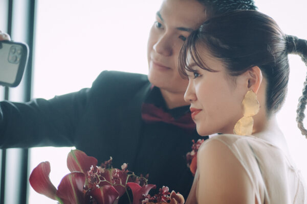 再入場やデザートビュッフェのシーンで新郎新婦2人が