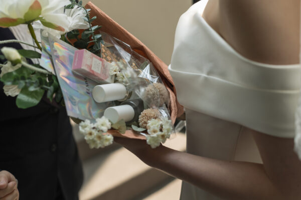 挙式後、披露宴までのお時間に行うことが多いブーケトスなどの代わりとして今とても人気なコスメブーケトス。