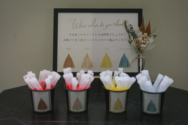 会場の入り口付近に一つだけご用意するシーティングチャートというアイテムをご用意されるかどちらかでゲストの皆様のお席を知らせるアイテムが必要となります。