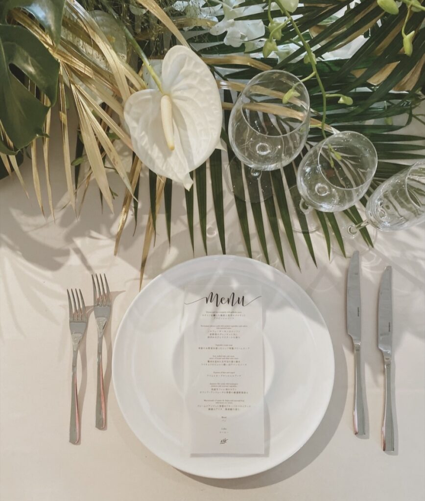 ナフキンフラワーは胡蝶蘭 更に大理石風の席札をオン