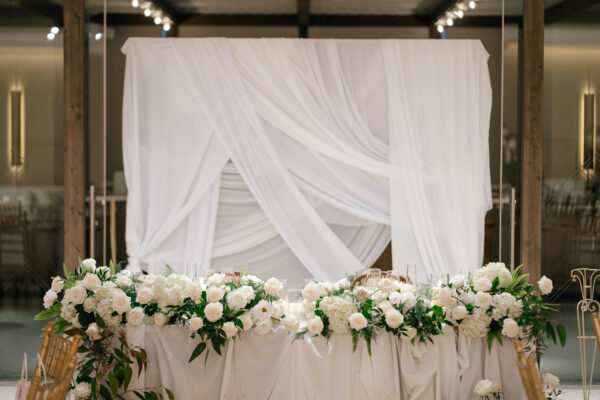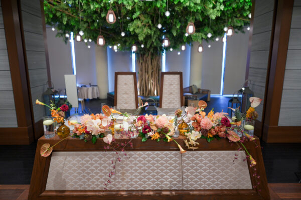 おふたりの前にボリューム感ある装花がくるので上品さ・華やかさも出る