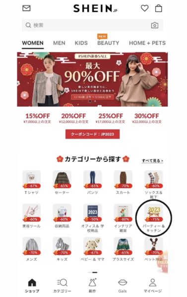 SHEINのアプリを開き【カテゴリーから探す】より【パーティー&キッチン】や【ドレス】等、気になるタブを開くと、装飾等に使用できるアイテムがたくさん出てきます✨